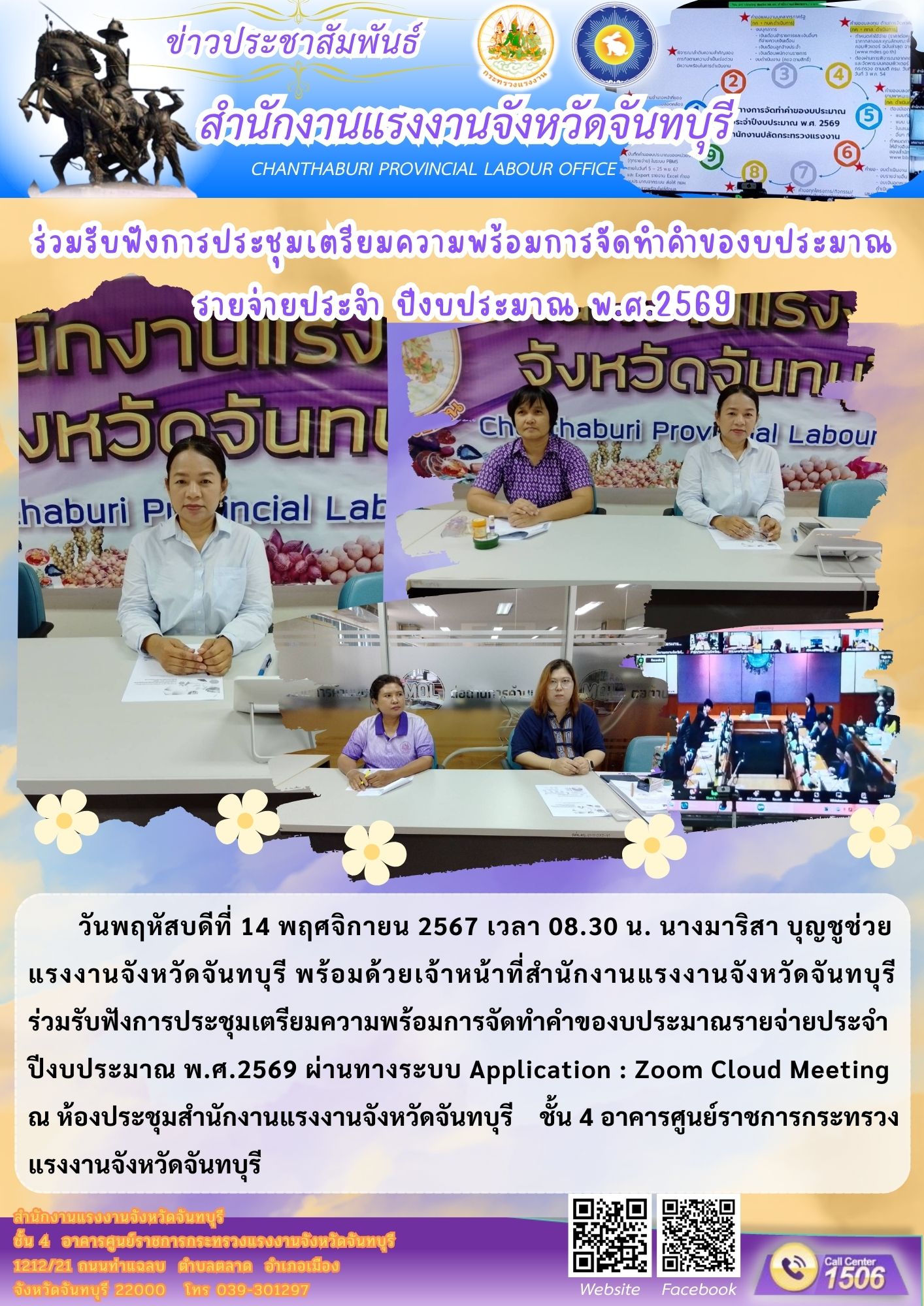 นางมาริสา บุญชูช่วย แรงงานจังหวัดจันทบุรี พร้อมด้วยเจ้าหน้าที่สำนักงานแรงงานจังหวัดจันทบุรี ร่วมรับฟังการประชุมเตรียมความพร้อมการจัดทำคำของบประมาณรายจ่ายประจำ ปีงบประมาณ พ.ศ.2569
