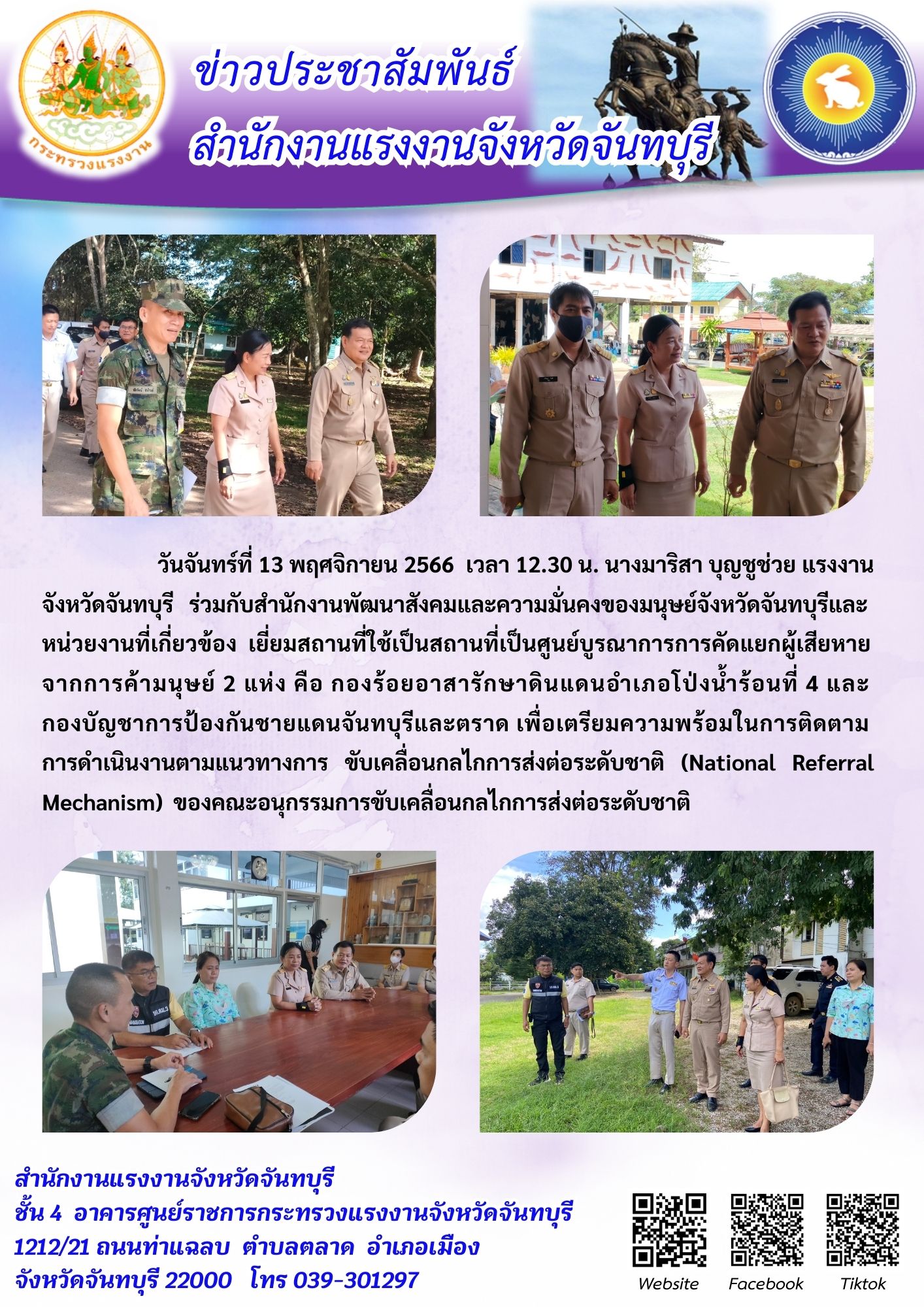 สรจ.จันทบุรี ร่วมกับสำนักงานพัฒนาสังคมและความมั่นคงของมนุษย์จังหวัดจันทบุรีและหน่วยงานที่เกี่ยวข้อง เยี่ยมสถานที่ใช้เป็นสถานที่เป็นศูนย์บูรณาการการคัดแยกผู้เสียหายจากการค้ามนุษย์