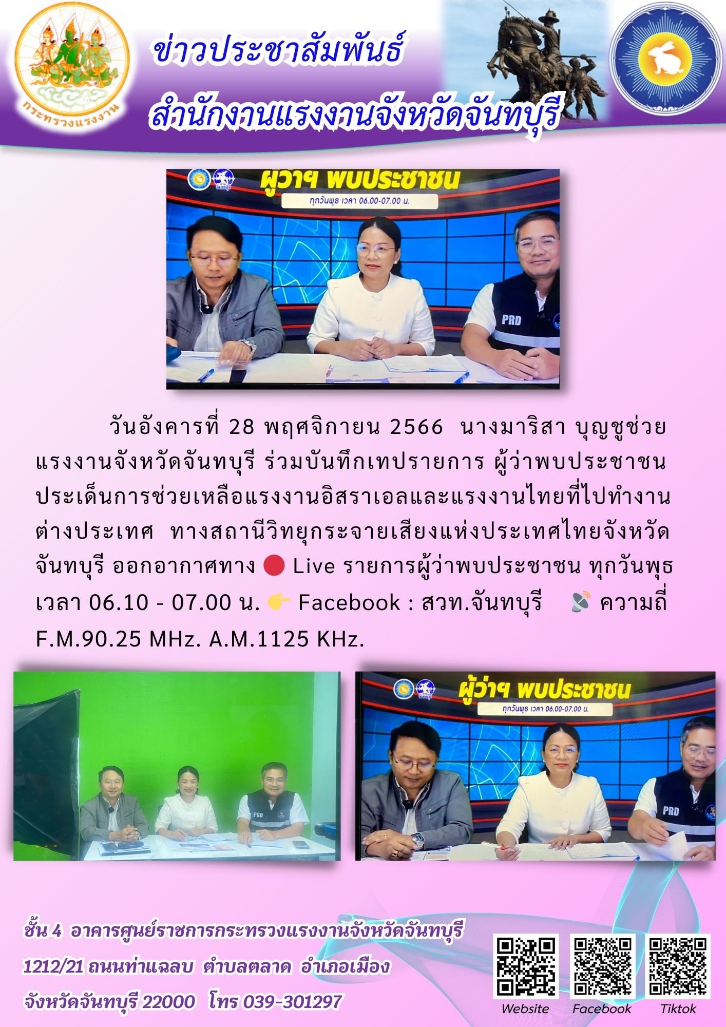 สรจ.จันทบุรี ร่วมบันทึกเทปรายการ “ผู้ว่าพบประชาชน” ประเด็นการช่วยเหลือแรงงานอิสราเอลและแรงงานไทยที่ไปทำงานต่างประเทศ