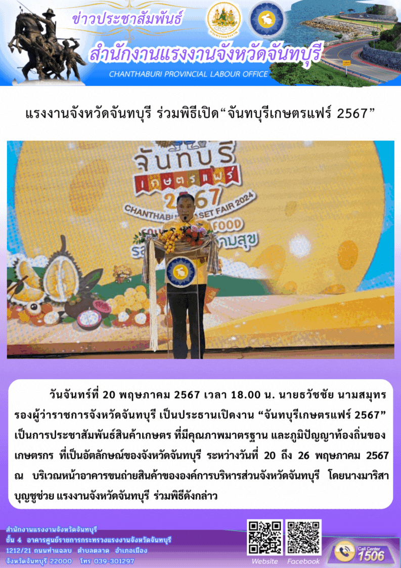 นางมาริสา บุญชูช่วย แรงงานจังหวัดจันทบุรี ร่วมพิธีเปิดงาน “จันทบุรีเกษตรแฟร์ 2567”