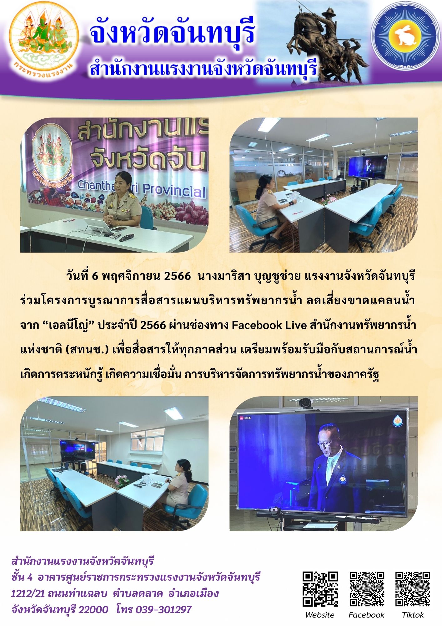 สรจ.จันทบุรี ร่วมโครงการบูรณาการสื่อสารแผนบริหารทรัพยากรน้ำ ลดเสี่ยงขาดแคลนน้ำจาก “เอลนีโญ่” ประจำปี 2566 ผ่านช่องทาง Facebook Live