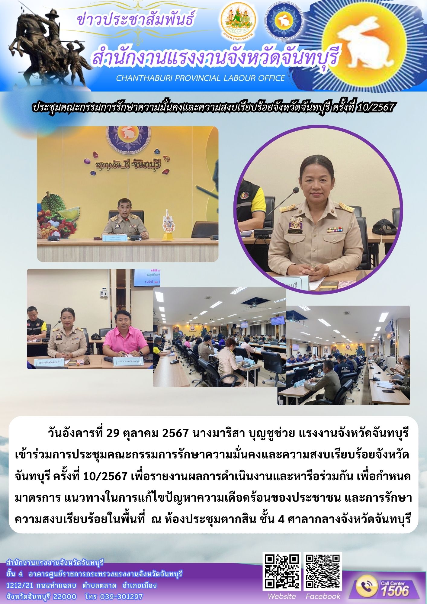 นางมาริสา บุญชูช่วย แรงงานจังหวัดจันทบุรี เข้าร่วมการประชุมคณะกรรมการรักษาความมั่นคงและความสงบเรียบร้อยจังหวัดจันทบุรี ครั้งที่ 10/2567