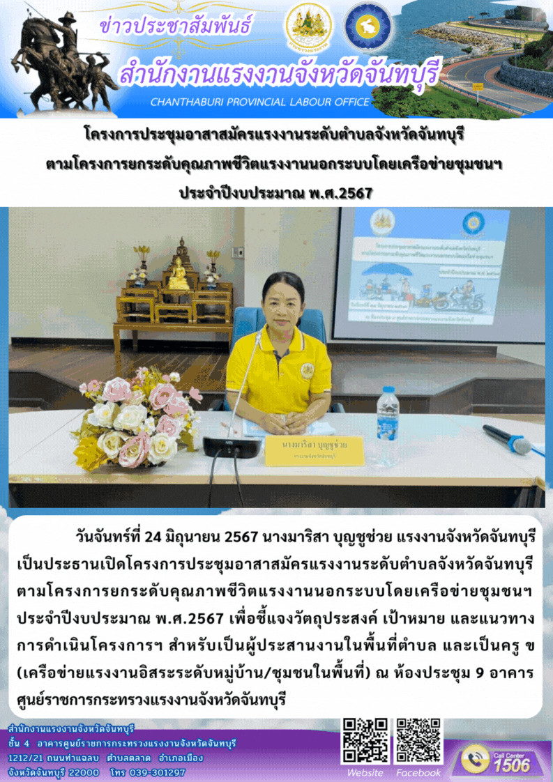 นางมาริสา บุญชูช่วย แรงงานจังหวัดจันทบุรี เป็นประธานเปิดโครงการประชุมอาสาสมัครแรงงานระดับตำบลจังหวัดจันทบุรี ตามโครงการยกระดับคุณภาพชีวิตแรงงานนอกระบบโดยเครือข่ายชุมชนฯ ประจำปีงบประมาณ พ.ศ.2567