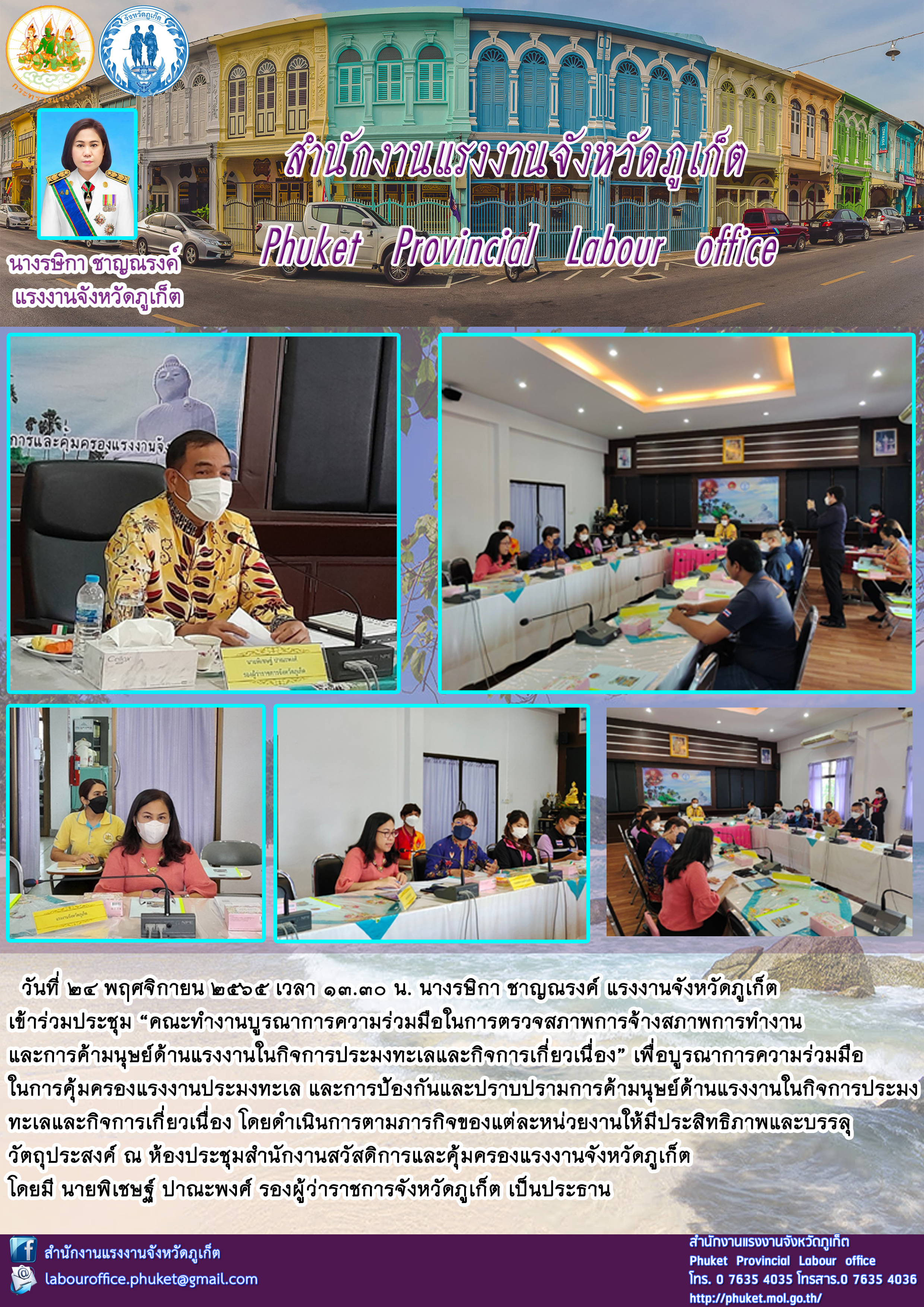 นางรษิกา ชาญณรงค์ แรงงานจังหวัดภูเก็ต เข้าร่วมประชุม “คณะทำงานบูรณาการความร่วมมือในการตรวจสภาพการจ้างสภาพการทำงาน และการค้ามนุษย์ด้านแรงงานในกิจการประมงทะเลและกิจการเกี่ยวเนื่อง”