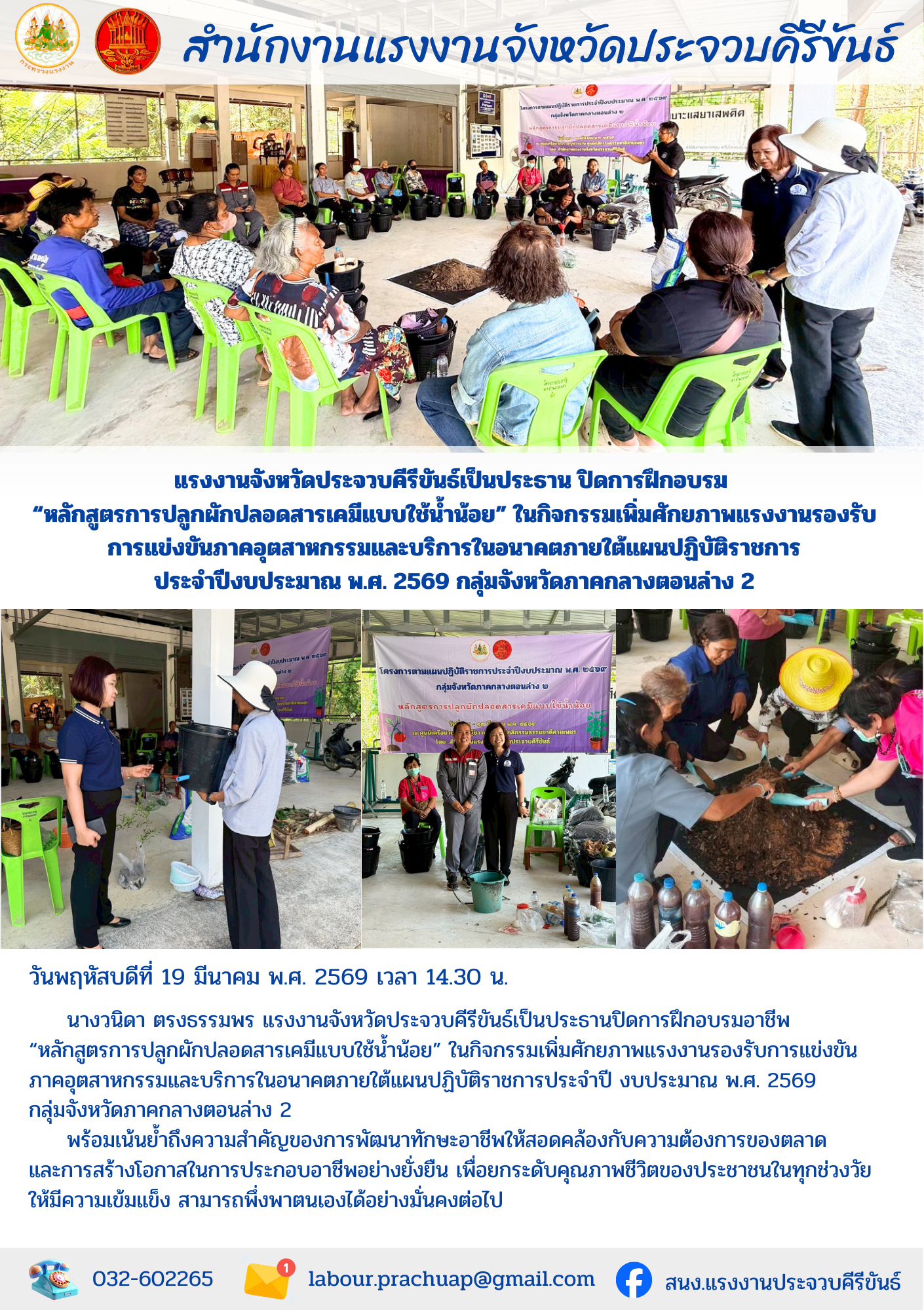 แรงงานจังหวัดประจวบคีรีขันธ์เป็นประธาน ปิดการฝึกอบรม “หลักสูตรการปลูกผักปลอดสารเคมีแบบใช้น้ำน้อย” ในกิจกรรมเพิ่มศักยภาพแรงงานรองรับ การแข่งขันภาคอุตสาหกรรมและบริการในอนาคตภายใต้แผนปฏิบัติราชการ ประจำปีงบประมาณ พ.ศ. 2569 กลุ่มจังหวัดภาคกลางตอนล่าง 2