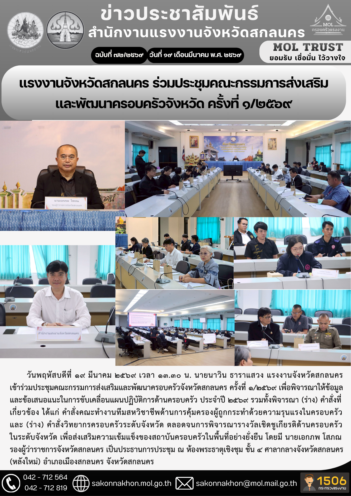 แรงงานจังหวัดสกลนคร ร่วมประชุมคณะกรรมการส่งเสริม และพัฒนาครอบครัวจังหวัด ครั้งที่ 1/2569