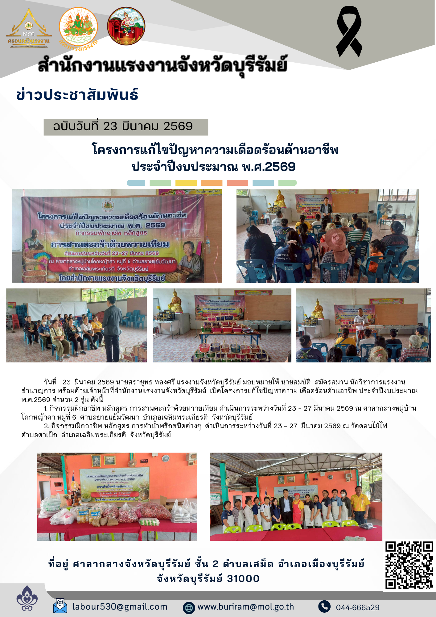 สำนักงานแรงงานจังหวัดบุรีรัมย์ เปิดโครงการแก้ไขปัญหาความเดือดร้อนด้านอาชีพ ประจำปีงบประมาณ พ.ศ.2569