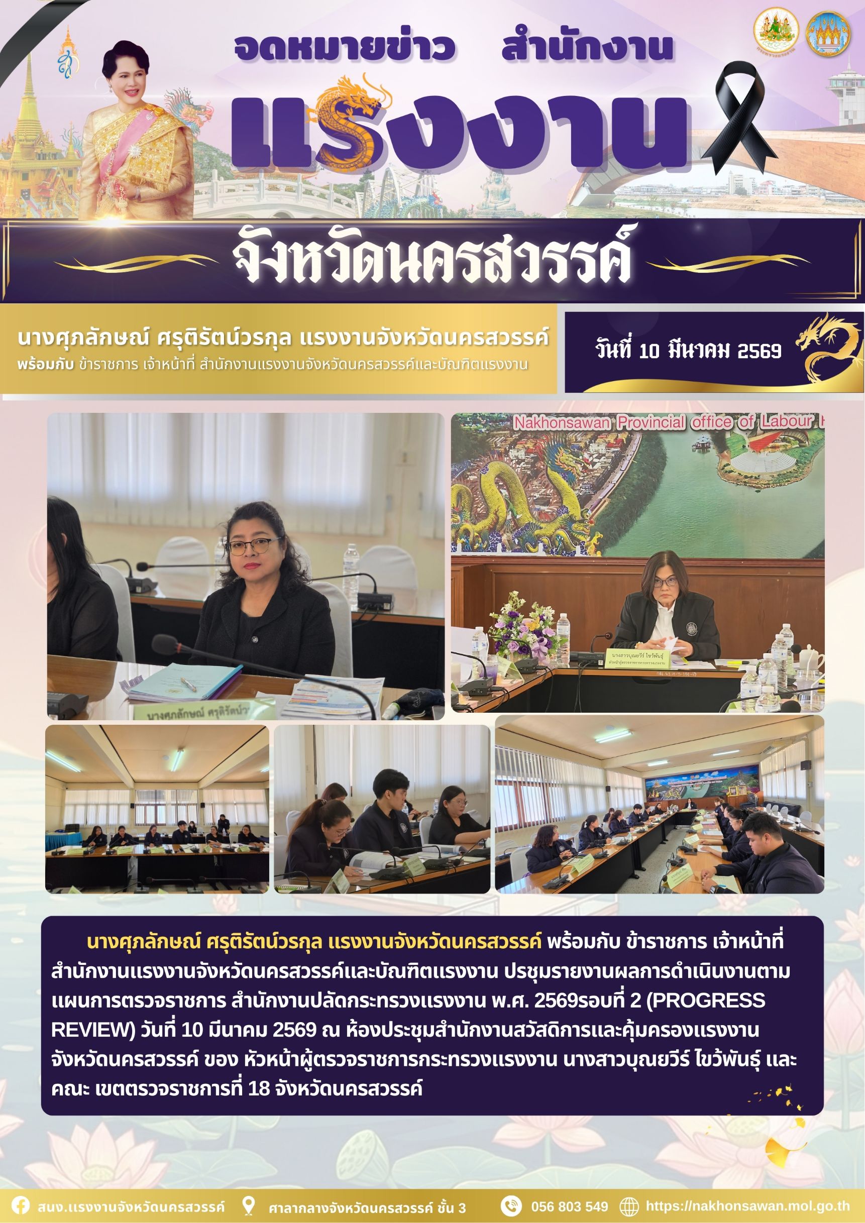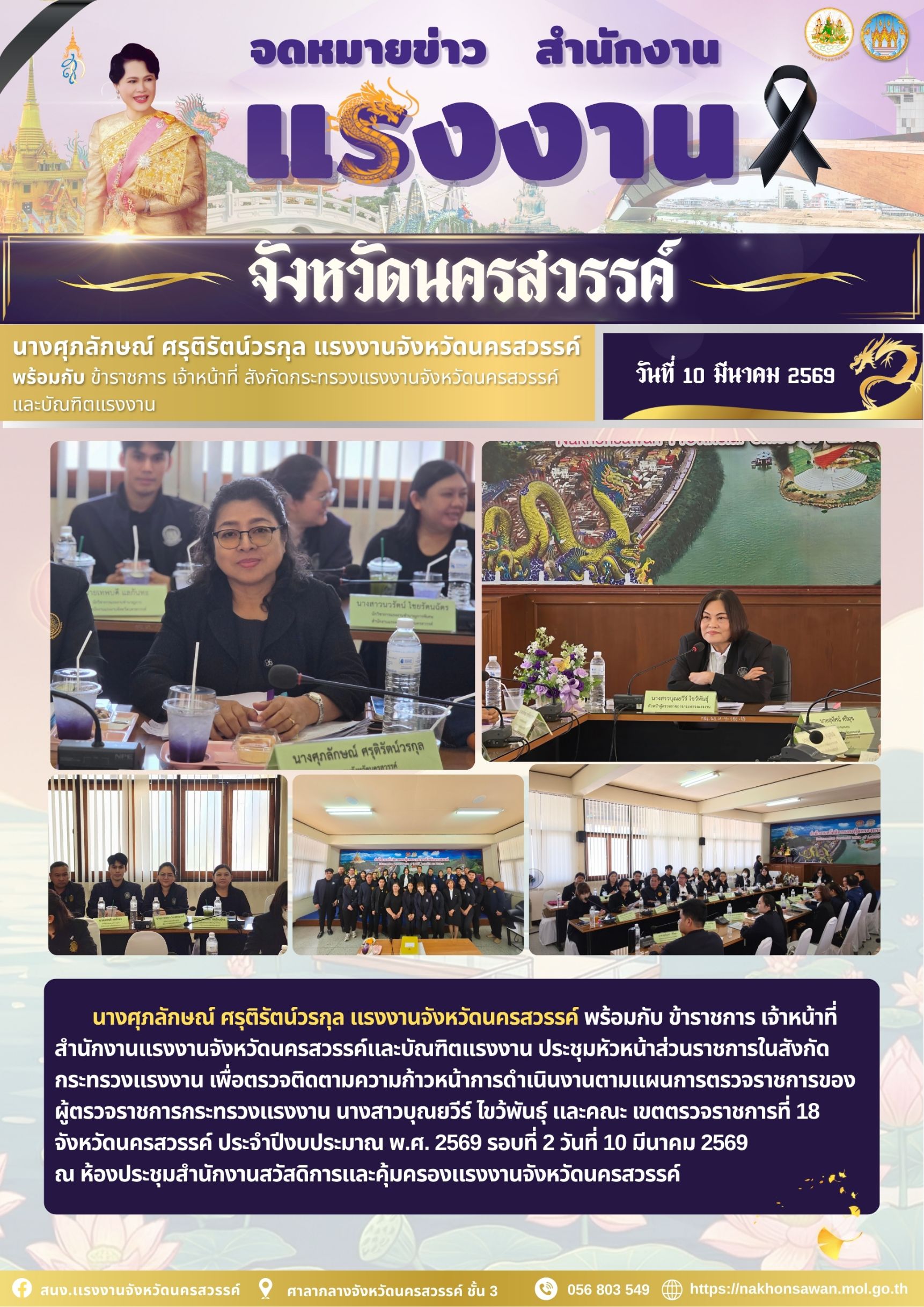 นางศุภลักษณ์ ศรุติรัตน์วรกุล แรงงานจังหวัดนครสวรรค์ พร้อมกับ ข้าราชการ เจ้าหน้าที่ สำนักงานแรงงานจังหวัดนครสวรรค์และบัณฑิตแรงงาน ปรชุมรายงานผลการดำเนินงานตามแผนการตรวจราชการ สำนักงานปลัดกระทรวงแรงงาน พ.ศ. 2569รอบที่ 2 (PROGRESS REVIEW) วันที่ 10 มีนาคม 2569 ณ ห้องประชุมสำนักงานสวัสดิการและคุ้มครองแรงงานจังหวัดนครสวรรค์ ของ หัวหน้าผู้ตรวจราชการกระทรวงแรงงาน นางสาวบุณยวีร์ ไขว้พันธุ์ และคณะ เขตตรวจราชการที่ 18 จังหวัดนครสวรรค์
