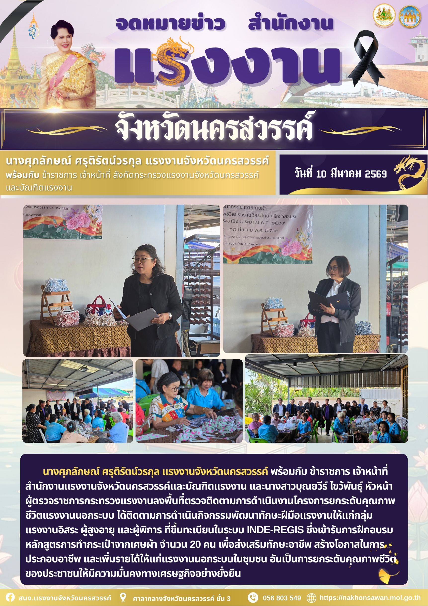นางศุภลักษณ์ ศรุติรัตน์วรกุล แรงงานจังหวัดนครสวรรค์ พร้อมกับ ข้าราชการ เจ้าหน้าที่ สำนักงานแรงงานจังหวัดนครสวรรค์และบัณฑิตแรงงาน และนางสาวบุณยวีร์ ไขว้พันธุ์ หัวหน้า ผู้ตรวจราชการกระทรวงแรงงานลงพื้นที่ตรวจติดตามการดำเนินงานโครงการยกระดับคุณภาพชีวิตแรงงานนอกระบบ ได้ติดตามการดำเนินกิจกรรมพัฒนาทักษะฝีมือแรงงานให้แก่กลุ่มแรงงานอิสระ ผู้สูงอายุ และผู้พิการ ที่ขึ้นทะเบียนในระบบ INDE-REGIS ซึ่งเข้ารับการฝึกอบรมหลักสูตรการทำกระเป๋าจากเศษผ้า จำนวน 20 คน เพื่อส่งเสริมทักษะอาชีพ สร้างโอกาสในการประกอบอาชีพ และเพิ่มรายได้ให้แก่แรงงานนอกระบบในชุมชน อันเป็นการยกระดับคุณภาพชีวิตของประชาชนให้มีความมั่นคงทางเศรษฐกิจอย่างยั่งยืน