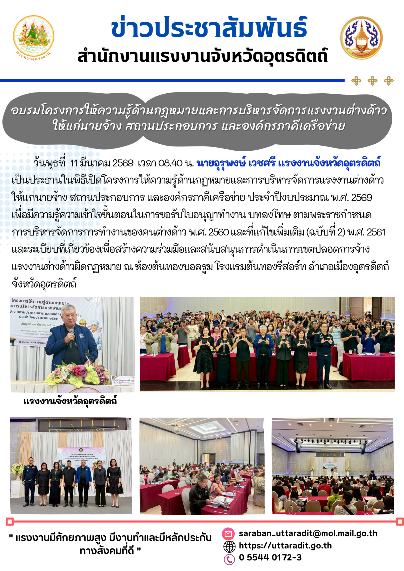 แรงงานจังหวัดอุตรดิตถ์ เป็นประธานเปิดการอบรมโครงการให้ความรู้ด้านกฏหมายและการบริหารจัดการแรงงานต่างด้าวให้แก่นายจ้าง สถานประกอบการ และองค์กรภาคีเครือข่าย