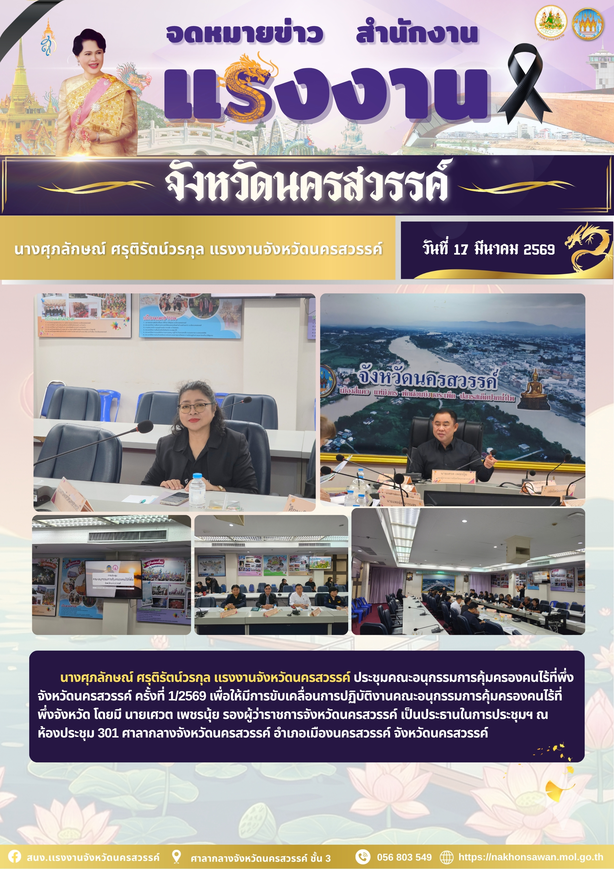 นางศุภลักษณ์ ศรุติรัตน์วรกุล แรงงานจังหวัดนครสวรรค์ ประชุมคณะอนุกรรมการคุ้มครองคนไร้ที่พึ่งจังหวัดนครสวรรค์ ครั้งที่ 1/2569 เพื่อให้มีการขับเคลื่อนการปฏิบัติงานคณะอนุกรรมการคุ้มครองคนไร้ที่พึ่งจังหวัด โดยมี นายเศวต เพชรนุ้ย รองผู้ว่าราชการจังหวัดนครสวรรค์ เป็นประธานในการประชุมฯ ณ ห้องประชุม 301 ศาลากลางจังหวัดนครสวรรค์ อําเภอเมืองนครสวรรค์ จังหวัดนครสวรรค์