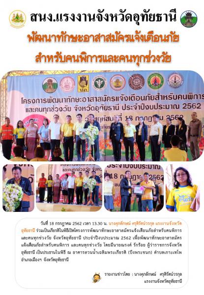 นางศุภลักษณ์ ศรุติรัตน์วรกุล แรงงานจังหวัดอุทัยธานี ร่วมพิธีเปิดโครงการพัฒนาทักษะอาสาสมัครแจ้งเตือนภัยสำหรับคนพิการและคนทุกช่วงวัย