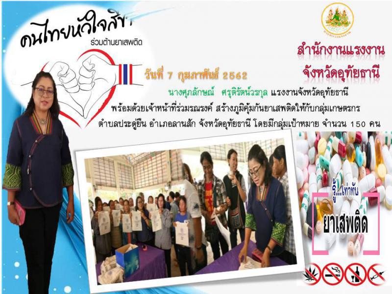 นางศุภลักษณ์ ศรุติรัตน์วรกุล แรงงานจังหวัดอุทัยธานี ร่วมรณรงค์สร้างภูมิคุ้มกันยาเสพติด