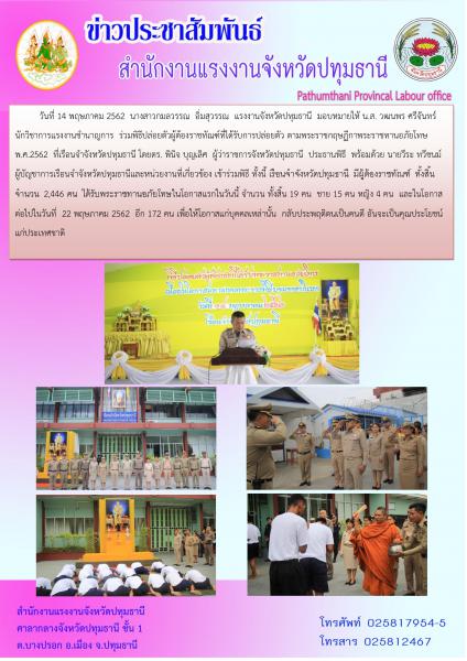 นางสาวกมลวรรณ อิ่มสุวรรณ แรงงานจังหวัดปทุมธานี มอบหมายให้ น.ส. วฒนพร ศรีจันทร์ นักวิชาการแรงงานชำนาญการ ร่วมพิธีปล่อยตัวผู้ต้องราชทัณฑ์ที่ได้รับการปล่อยตัว ตามพระราชกฤษฏีกาพระราชทานอภัยโทษ พ.ศ.2562 ที่เรือนจำจังหวัดปทุมธานี