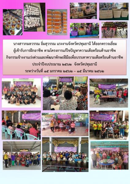 นางสาวกมลวรรณ อิ่มสุวรรณ แรงงานจังหวัดปทุมธานี ได้ออกตรวจเยี่ยมผู้เข้ารับการฝึกอาชีพ ตามโครงการแก้ไขปัญหาความเดือดร้อนด้านอาชีพ กิจกรรมจ้างงานเร่งด่วนและพัฒนาทักษะฝีมือเพื่อบรรเทาความเดือดร้อนด้านอาชีพ ประจำปีงบประมาณ 2562 จังหวัดปทุมธานี