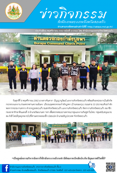 นางสาวจันดารา ปัญญานุวัฒน์ แรงงานจังหวัดสระแก้ว พร้อมด้วยหน่วยงานในสังกัดกระทรวงแรงงาน ร่วมตรวจด่านความมั่นคง บริเวณจุดตรวจกองกำลังบูรพา (บ้านหนองกุง) ถนนสาย 33 ประกอบด้วยกำลังพลจากหน่วยงานทหาร ตำรวจภูธรสระแก้ว ขนส่งจังหวัดสระ