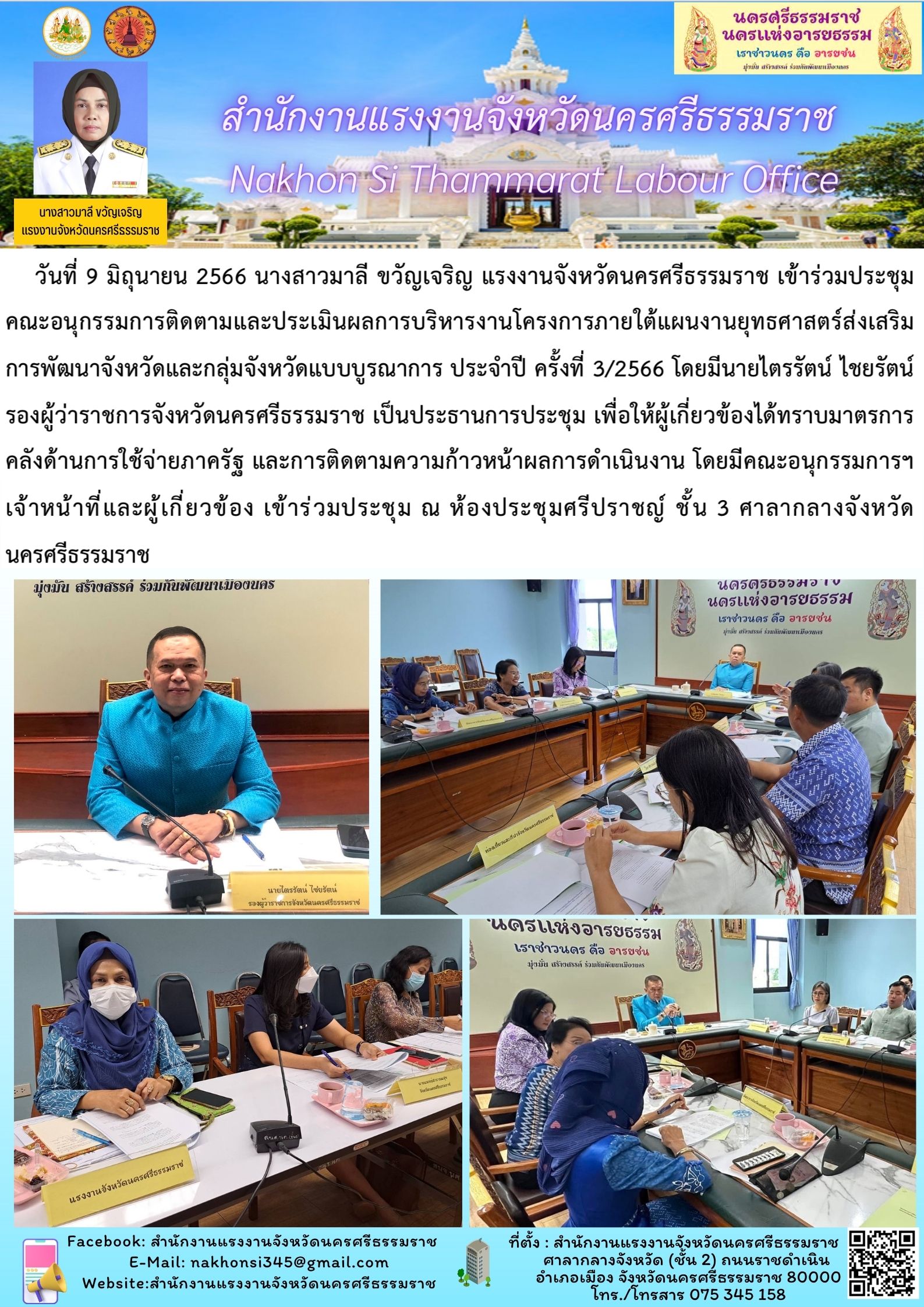 สรจ.นครศรีธรรมราช เข้าร่วมประชุมคณะอนุกรรมการติดตามและประเมินผลการบริหารงานโครงการภายใต้แผนงานยุทธศาสตร์ส่งเสริมการพัฒนาจังหวัดและกลุ่มจังหวัดแบบบูรณาการ ประจำปี ครั้งที่ 3/2566