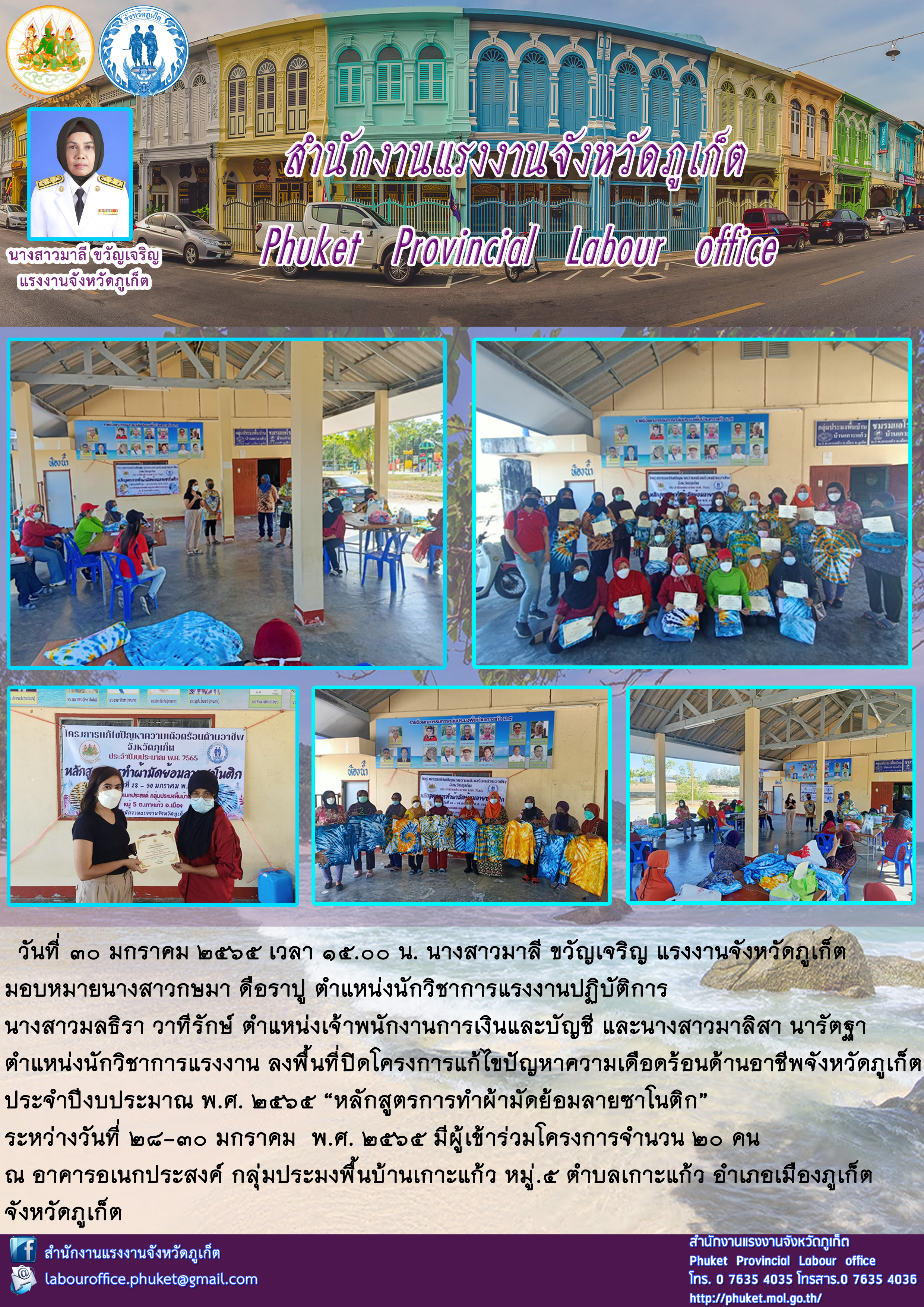 สรจ.ภูเก็ต ลงพื้นที่ปิดโครงการแก้ไขปัญหาความเดือดร้อนด้านอาชีพจังหวัดภูเก็ต ประจำปีงบประมาณ พ.ศ. 2565 “หลักสูตรการทำผ้ามัดย้อมลายซาโนติก”