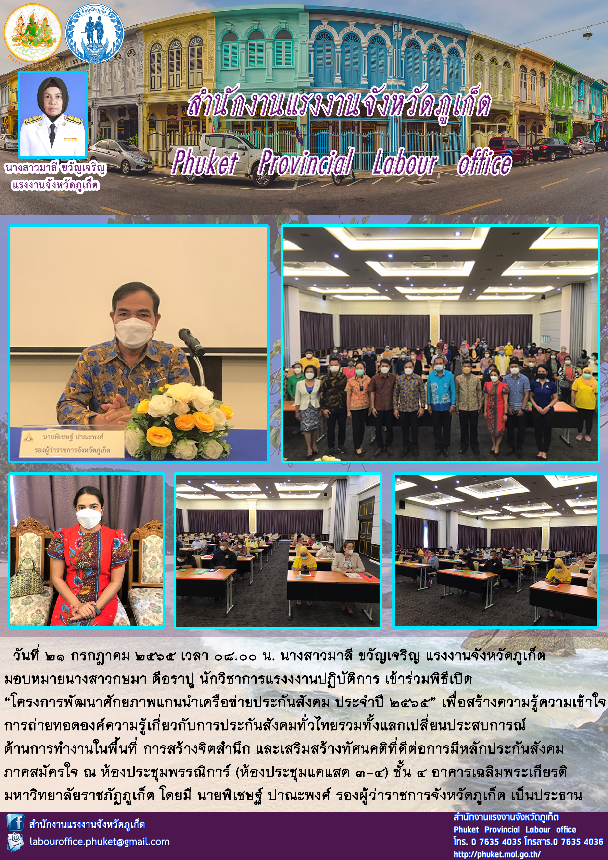 นางสาวมาลี ขวัญเจริญ แรงงานจังหวัดภูเก็ต มอบหมายนางสาวกษมา ดือราปู นักวิชาการแรงงงานปฏิบัติการ เข้าร่วมพิธีเปิด “โครงการพัฒนาศักยภาพแกนนำเครือข่ายประกันสังคม ประจำปี 2565”
