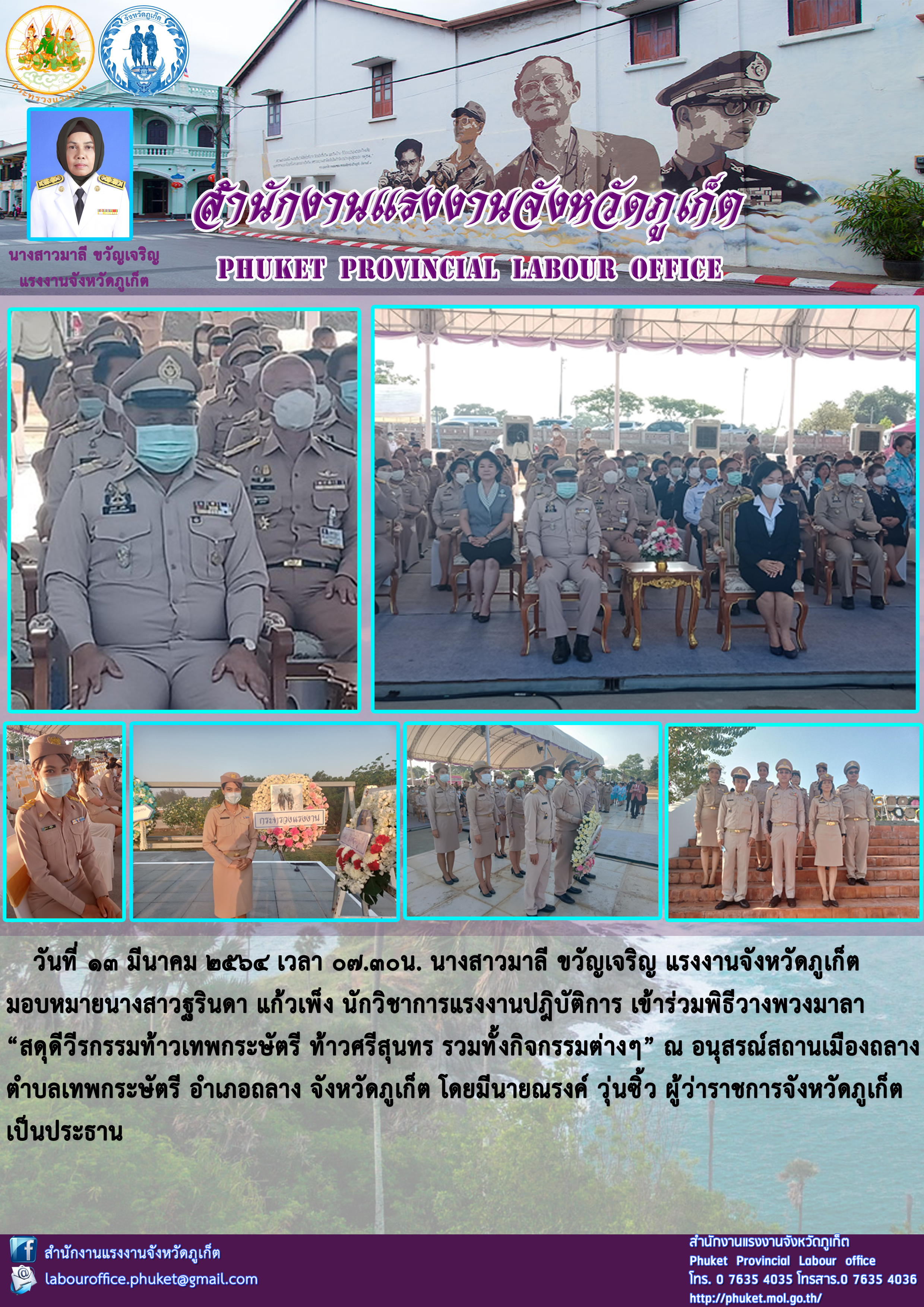 สำนักงานแรงงานจังหวัดภูเก็ต เข้าร่วมพิธีวางพวงมาลา “สดุดีวีรกรรมท้าวเทพกระษัตรี ท้าวศรีสุนทร รวมทั้งกิจกรรมต่างๆ”