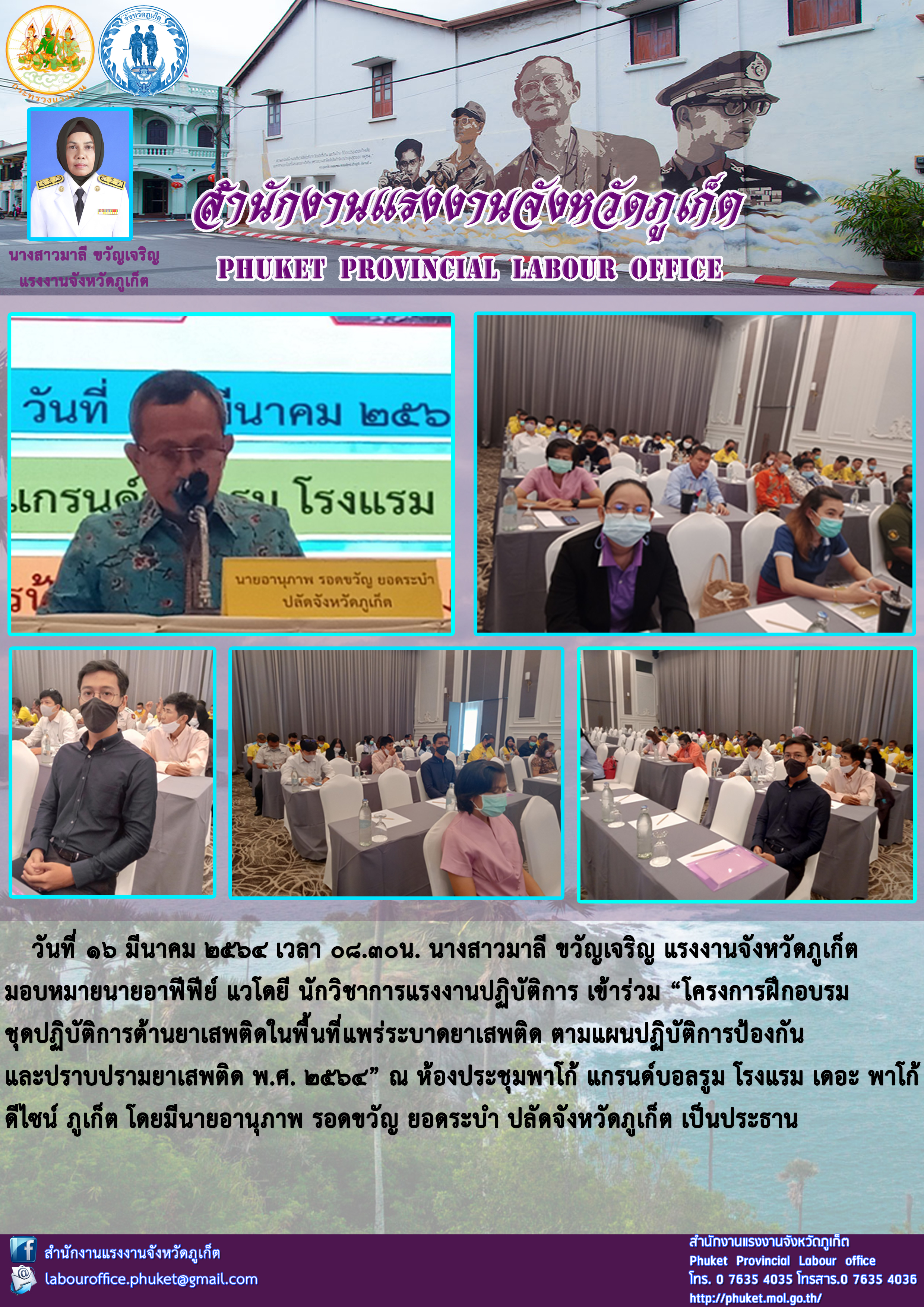 สำนักงานแรงงานจังหวัดภูเก็ต เข้าร่วม “โครงการฝึกอบรม ชุดปฏิบัติการต้านยาเสพติดในพื้นที่แพร่ระบาดยาเสพติด ตามแผนปฏิบัติการป้องกัน และปราบปรามยาเสพติด พ.ศ. 2564”