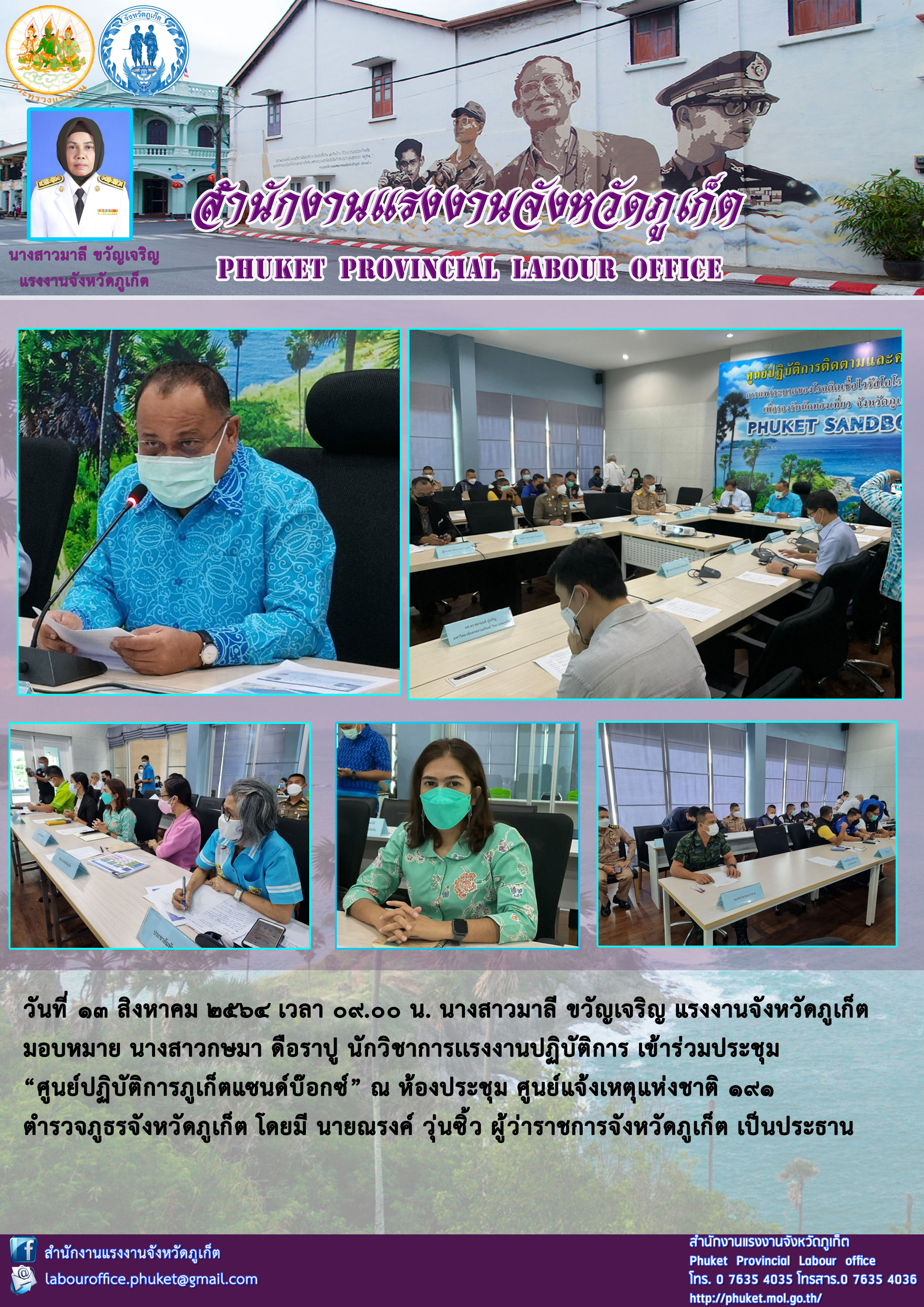 วันที่ 13 สิงหาคม 2564 เวลา 09.00 น. นางสาวมาลี ขวัญเจริญ แรงงานจังหวัดภูเก็ต มอบหมาย นางสาวกษมา ดือราปู นักวิชาการเเรงงานปฏิบัติการ เข้าร่วมประชุม “ศูนย์ปฏิบัติการภูเก็ตแซนด์บ๊อกซ์” ณ ห้องประชุม ศูนย์แจ้งเหตุแห่งชาติ 191 ตำรวจภูธรจังหวัดภูเก็ต โดยมี นายณรงค์ วุ่นซิ้ว ผู้ว่าราชการจังหวัดภูเก็ต เป็นประธาน
