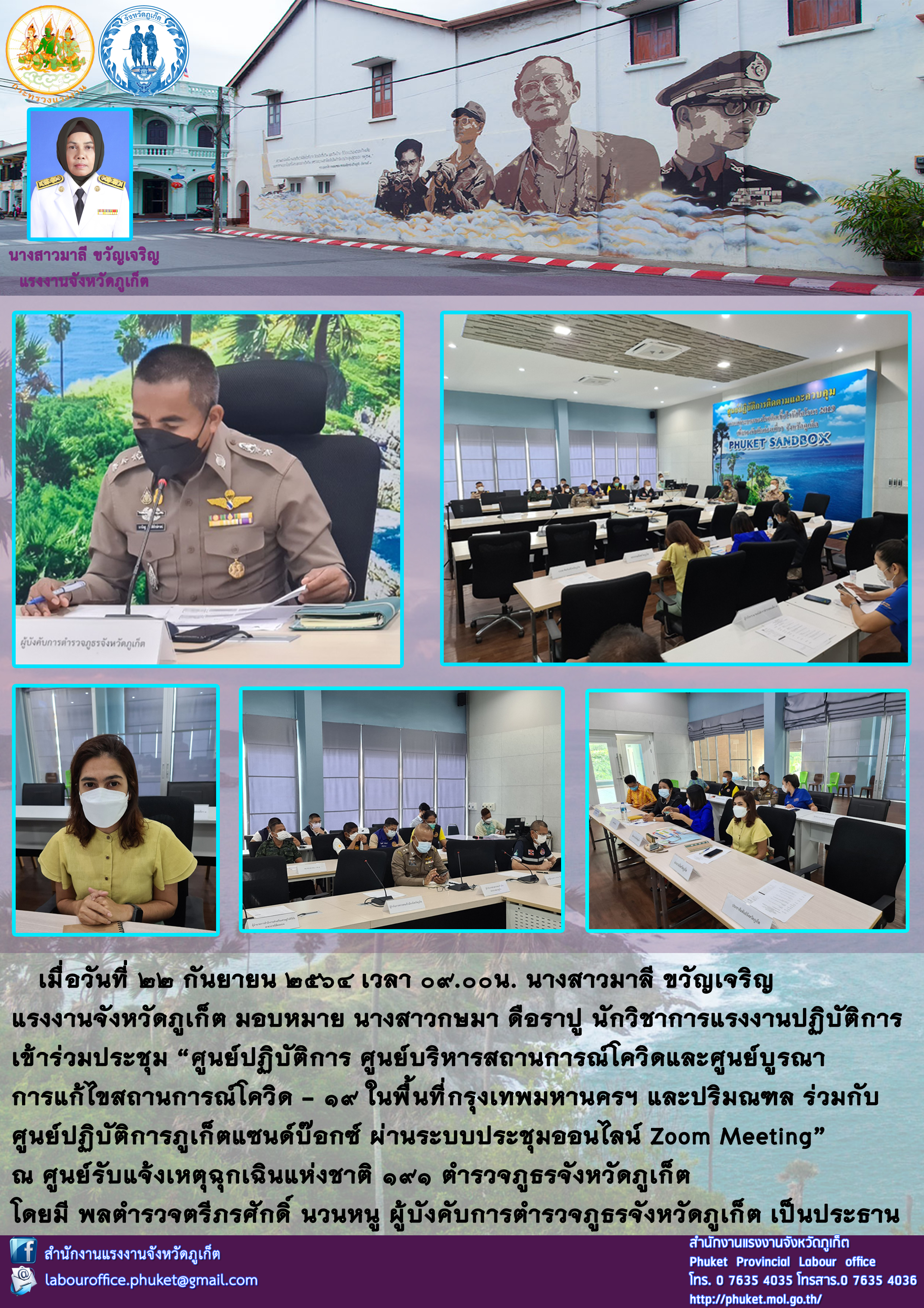 แรงงานจังหวัดภูเก็ตเข้าร่วมประชุม “ศูนย์ปฏิบัติการ ศูนย์บริหารสถานการณ์โควิดและศูนย์บูรณา การแก้ไขสถานการณ์โควิด – 19 ในพื้นที่กรุงเทพมหานครฯ และปริมณฑล ร่วมกับ ศูนย์ปฏิบัติการภูเก็ตแซนด์บ๊อกซ์ ผ่านระบบประชุมออนไลน์ Zoom Meeting”