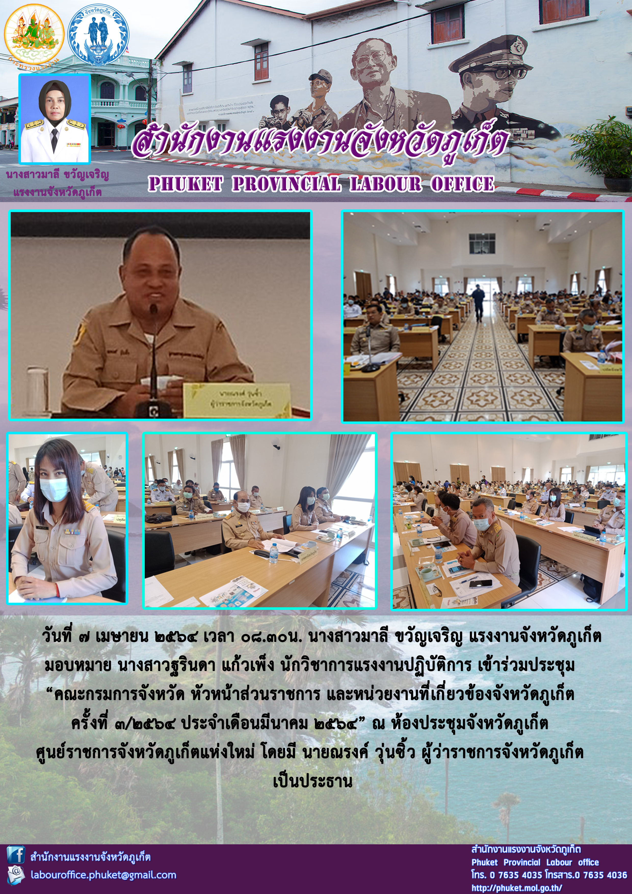 สำนักงานแรงงานจังหวัดภูเก็ต เข้าร่วมประชุม “คณะกรมการจังหวัด หัวหน้าส่วนราชการ และหน่วยงานที่เกี่ยวข้องจังหวัดภูเก็ต ครั้งที่ 3/2564 ประจำเดือนมีนาคม 2564”