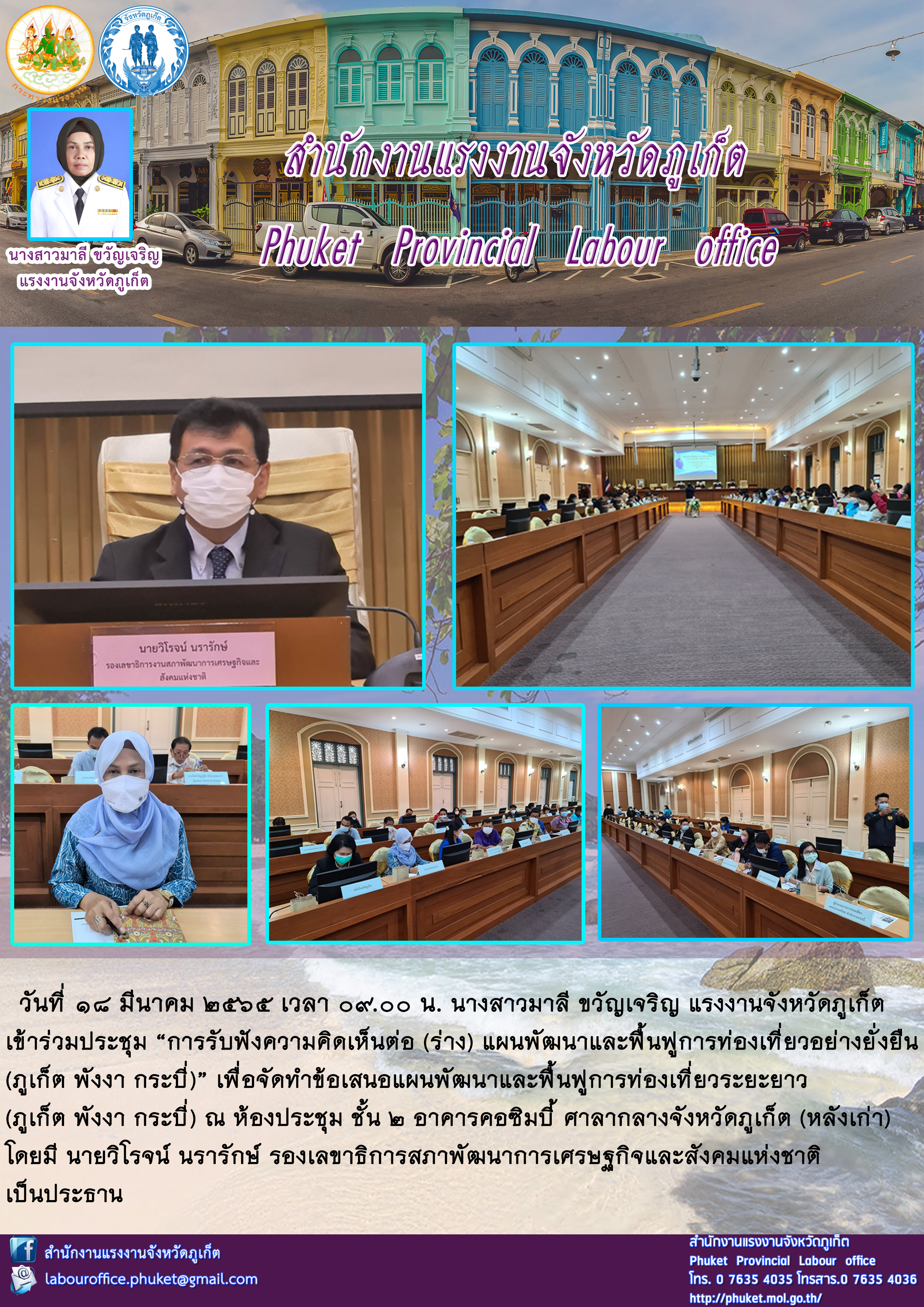 นางสาวมาลี ขวัญเจริญ แรงงานจังหวัดภูเก็ต เข้าร่วมประชุม “การรับฟังความคิดเห็นต่อ (ร่าง) แผนพัฒนาและฟื้นฟูการท่องเที่ยวอย่างยั่งยืน (ภูเก็ต พังงา กระบี่)”