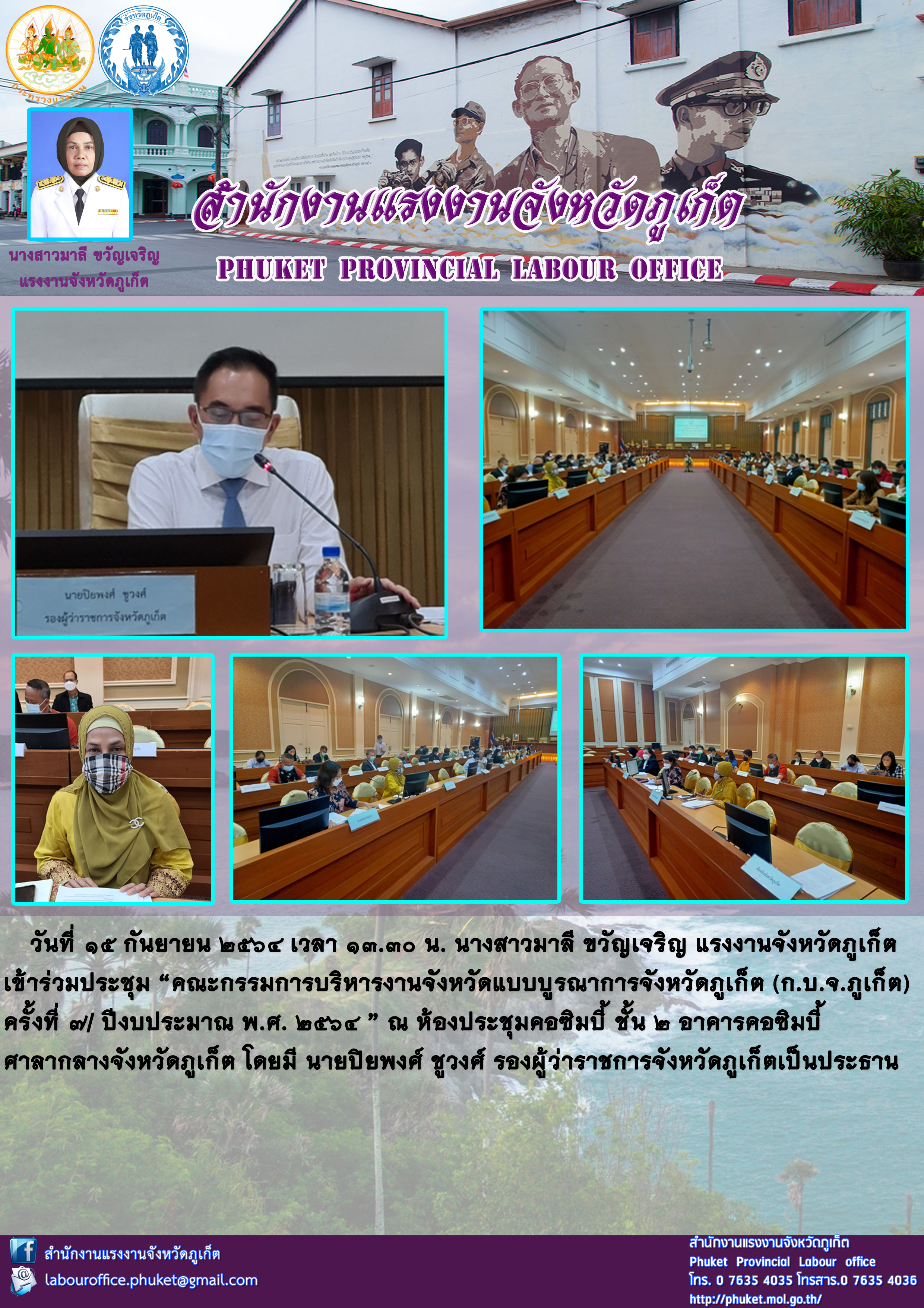 นางสาวมาลี ขวัญเจริญ แรงงานจังหวัดภูเก็ต เข้าร่วมประชุม “คณะกรรมการบริหารงานจังหวัดแบบบูรณาการจังหวัดภูเก็ต (ก.บ.จ.ภูเก็ต) ครั้งที่ 7/ ปีงบประมาณ พ.ศ. 2564 ”