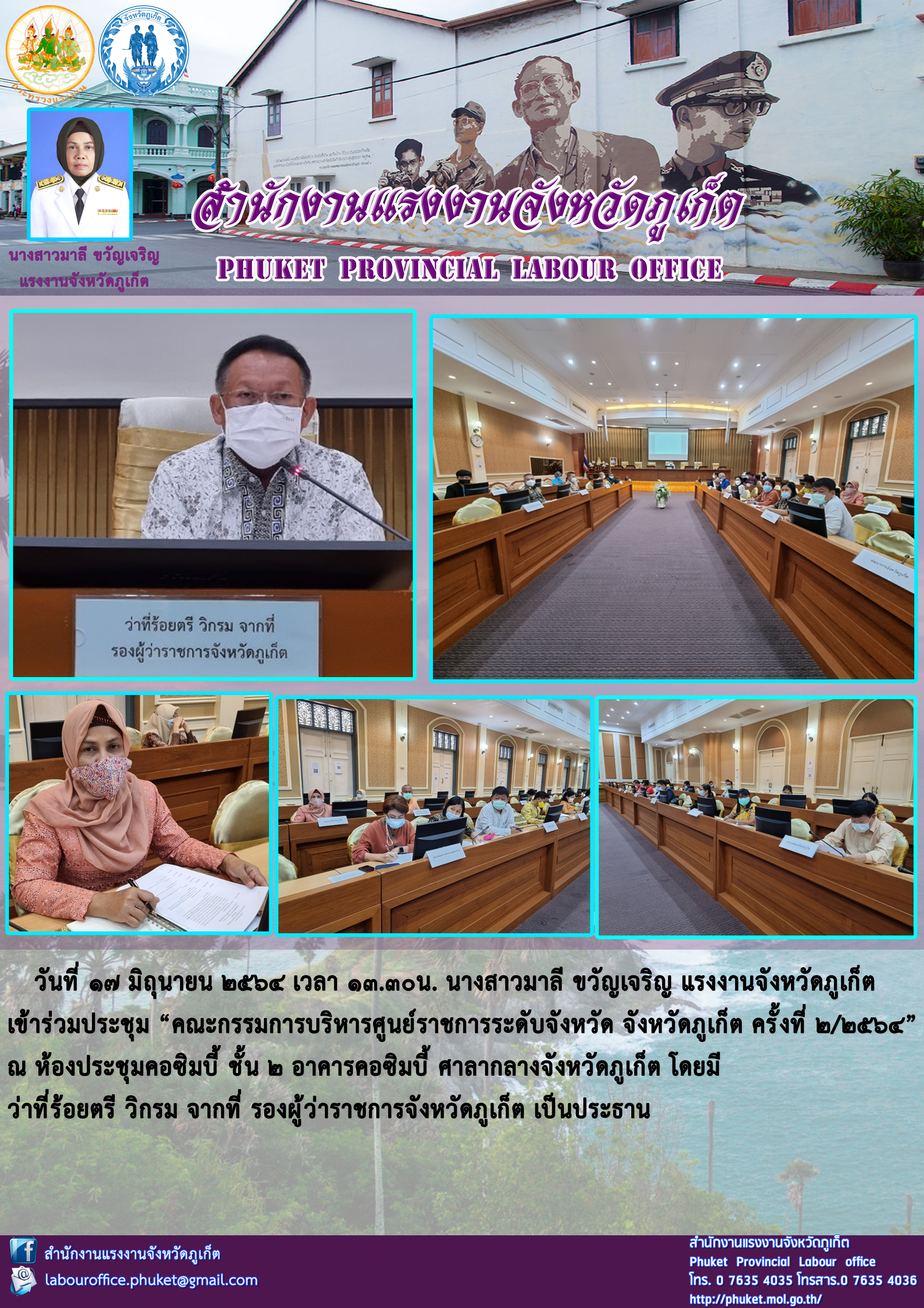 นางสาวมาลี ขวัญเจริญ แรงงานจังหวัดภูเก็ต เข้าร่วมประชุม “คณะกรรมการบริหารศูนย์ราชการระดับจังหวัด จังหวัดภูเก็ต ครั้งที่ 2/2564”