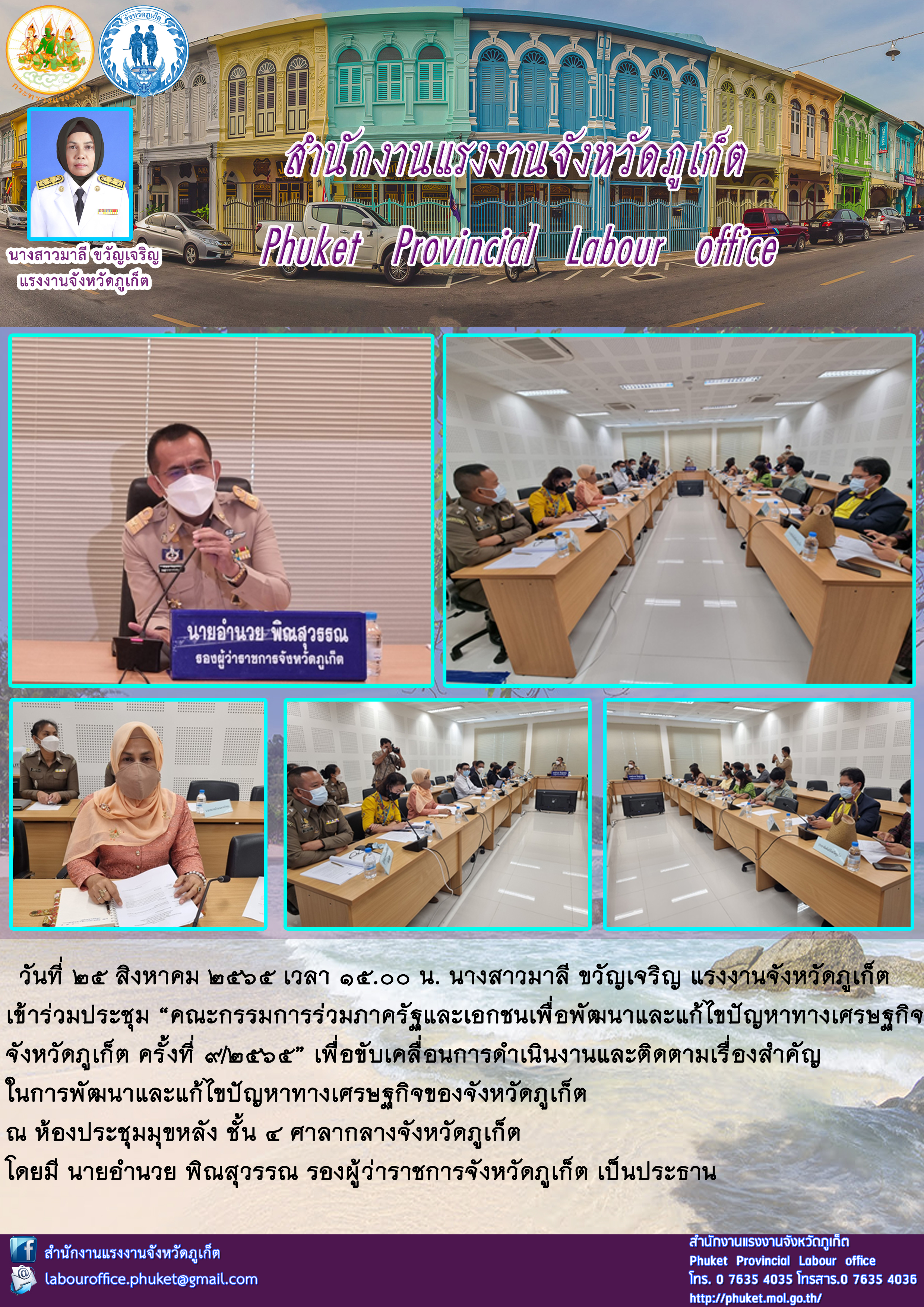 นางสาวมาลี ขวัญเจริญ แรงงานจังหวัดภูเก็ต เข้าร่วมประชุม “คณะกรรมการร่วมภาครัฐและเอกชนเพื่อพัฒนาและแก้ไขปัญหาทางเศรษฐกิจ จังหวัดภูเก็ต ครั้งที่ 9/2565”