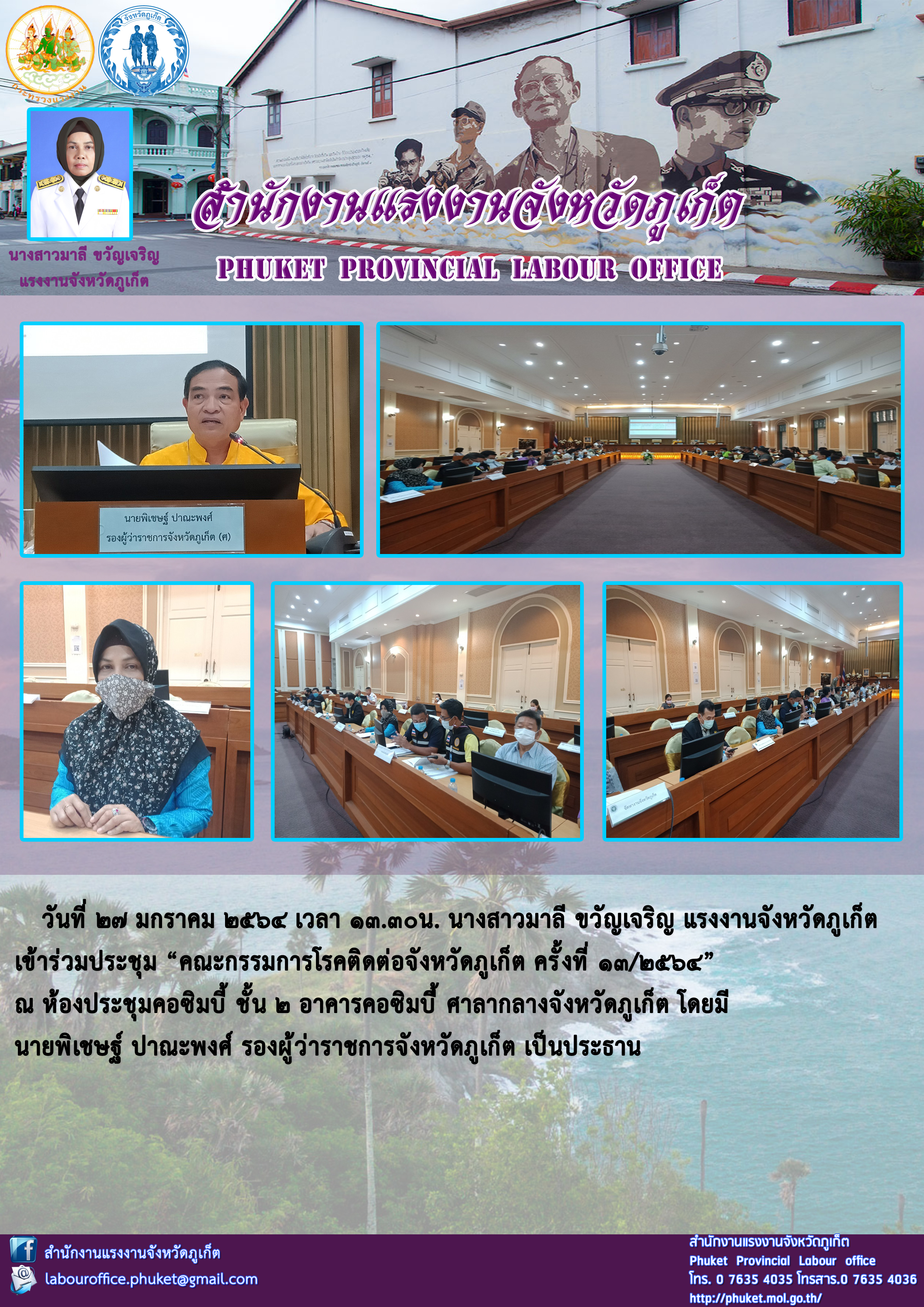 นางสาวมาลี ขวัญเจริญ แรงงานจังหวัดภูเก็ต เข้าร่วมประชุม “คณะกรรมการโรคติดต่อจังหวัดภูเก็ต ครั้งที่ 13/2564”