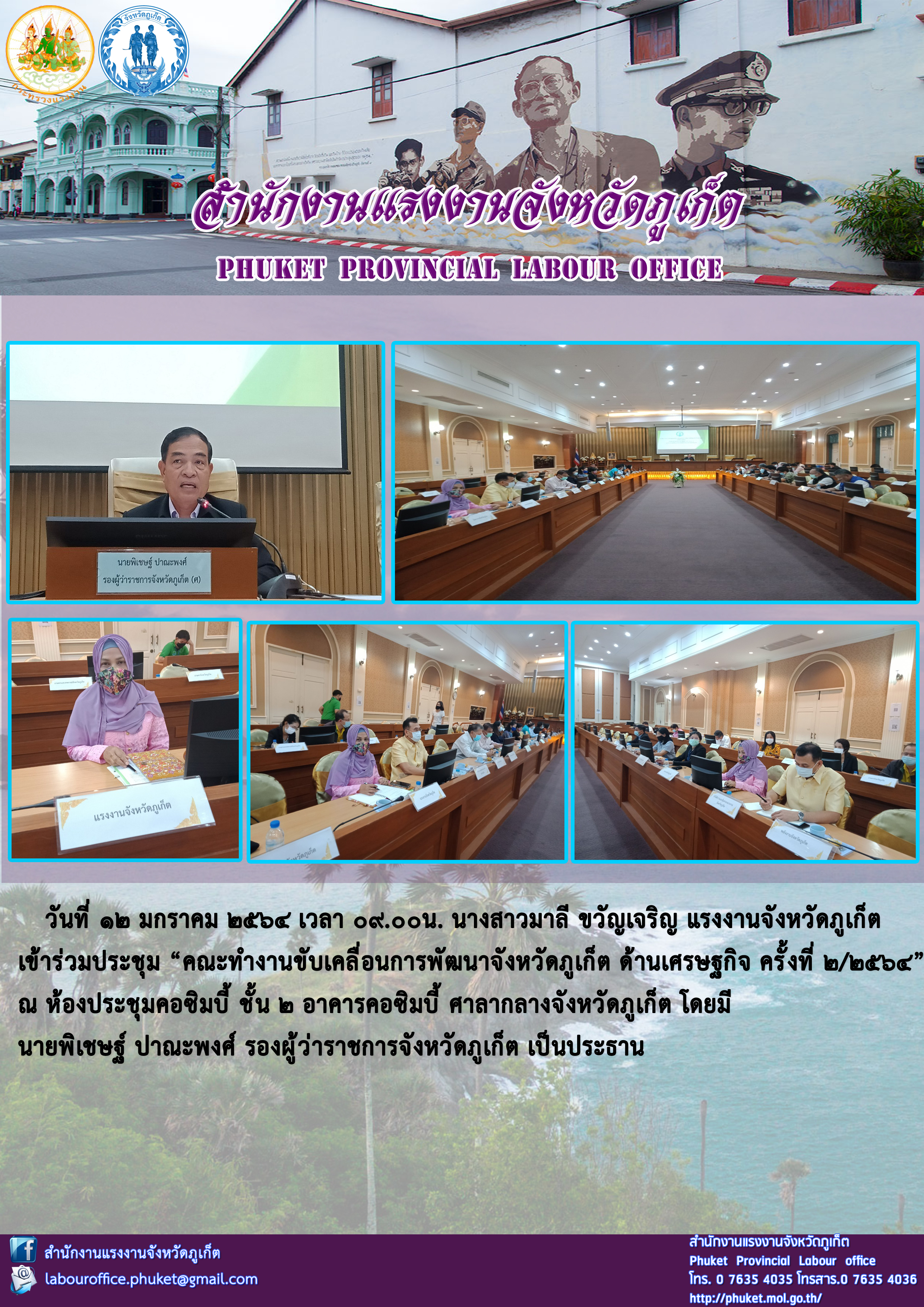 นางสาวมาลี ขวัญเจริญ แรงงานจังหวัดภูเก็ต เข้าร่วมประชุม “คณะทำงานขับเคลื่อนการพัฒนาจังหวัดภูเก็ต ด้านเศรษฐกิจ ครั้งที่ 2/2564”