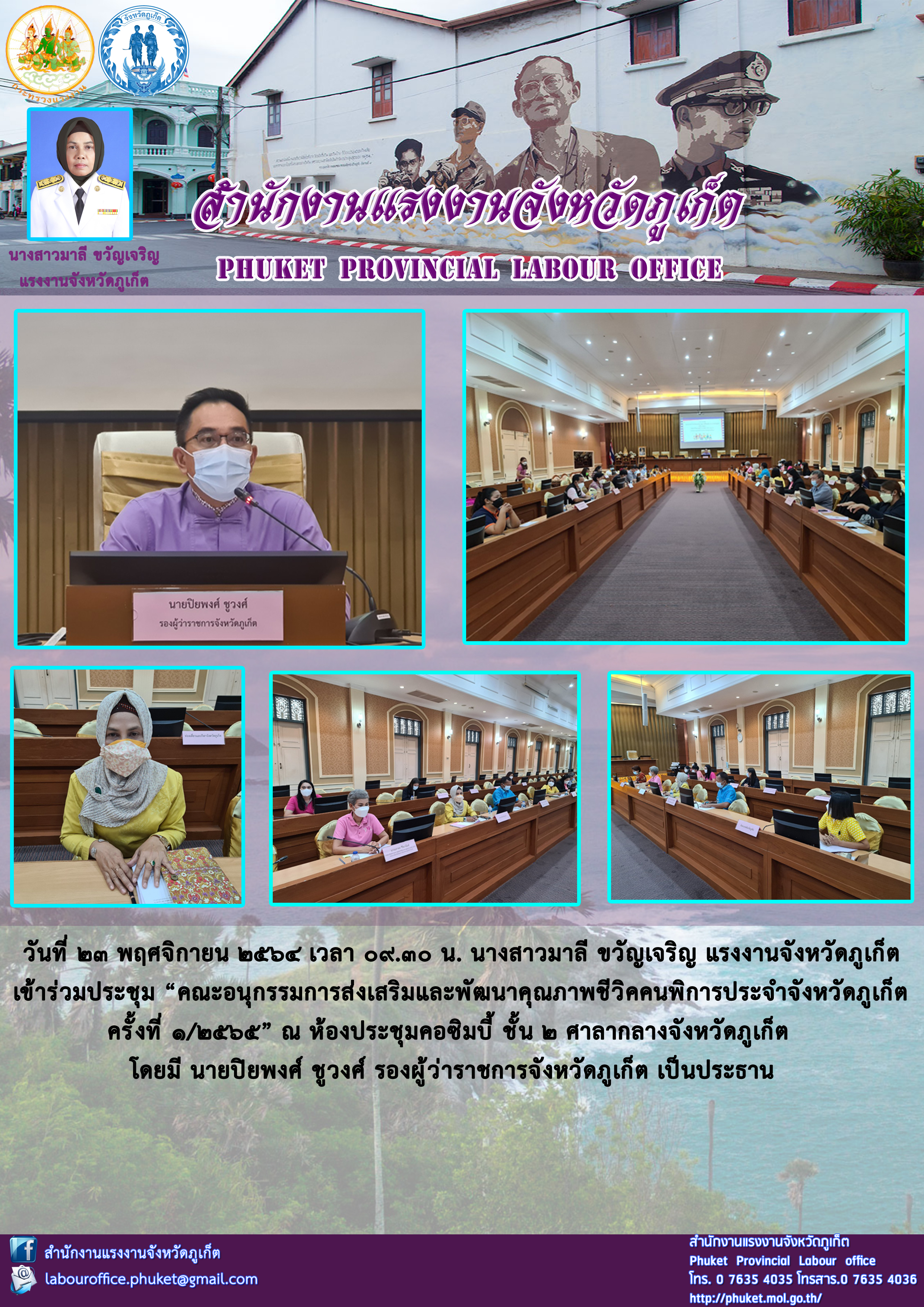 นางสาวมาลี ขวัญเจริญ แรงงานจังหวัดภูเก็ต เข้าร่วมประชุม “คณะอนุกรรมการส่งเสริมและพัฒนาคุณภาพชีวิคคนพิการประจำจังหวัดภูเก็ต ครั้งที่ ๑/๒๕๖๕”
