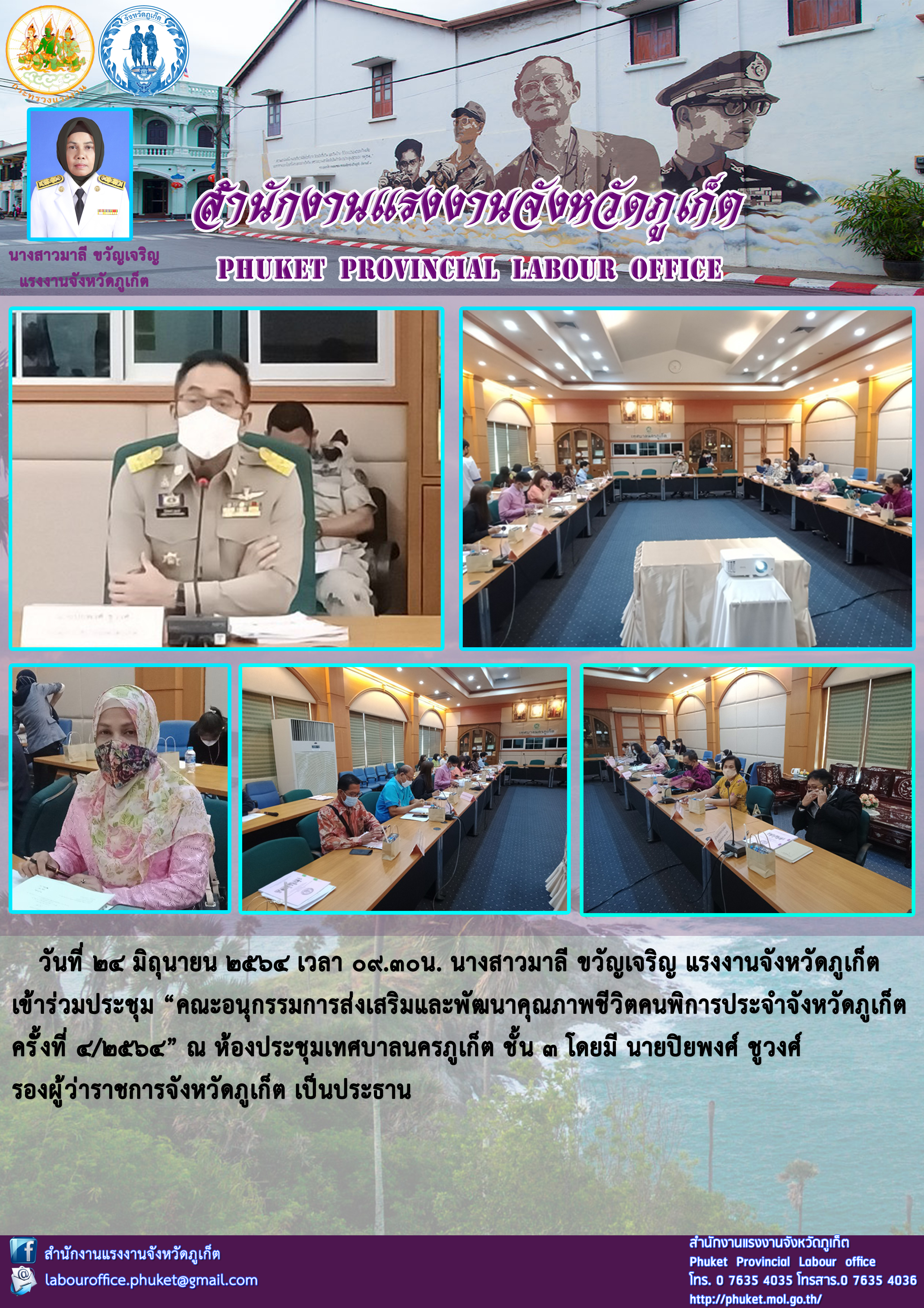 นางสาวมาลี ขวัญเจริญ แรงงานจังหวัดภูเก็ต เข้าร่วมประชุม “คณะอนุกรรมการส่งเสริมและพัฒนาคุณภาพชีวิตคนพิการประจำจังหวัดภูเก็ต ครัั้งที่ 4/2564”