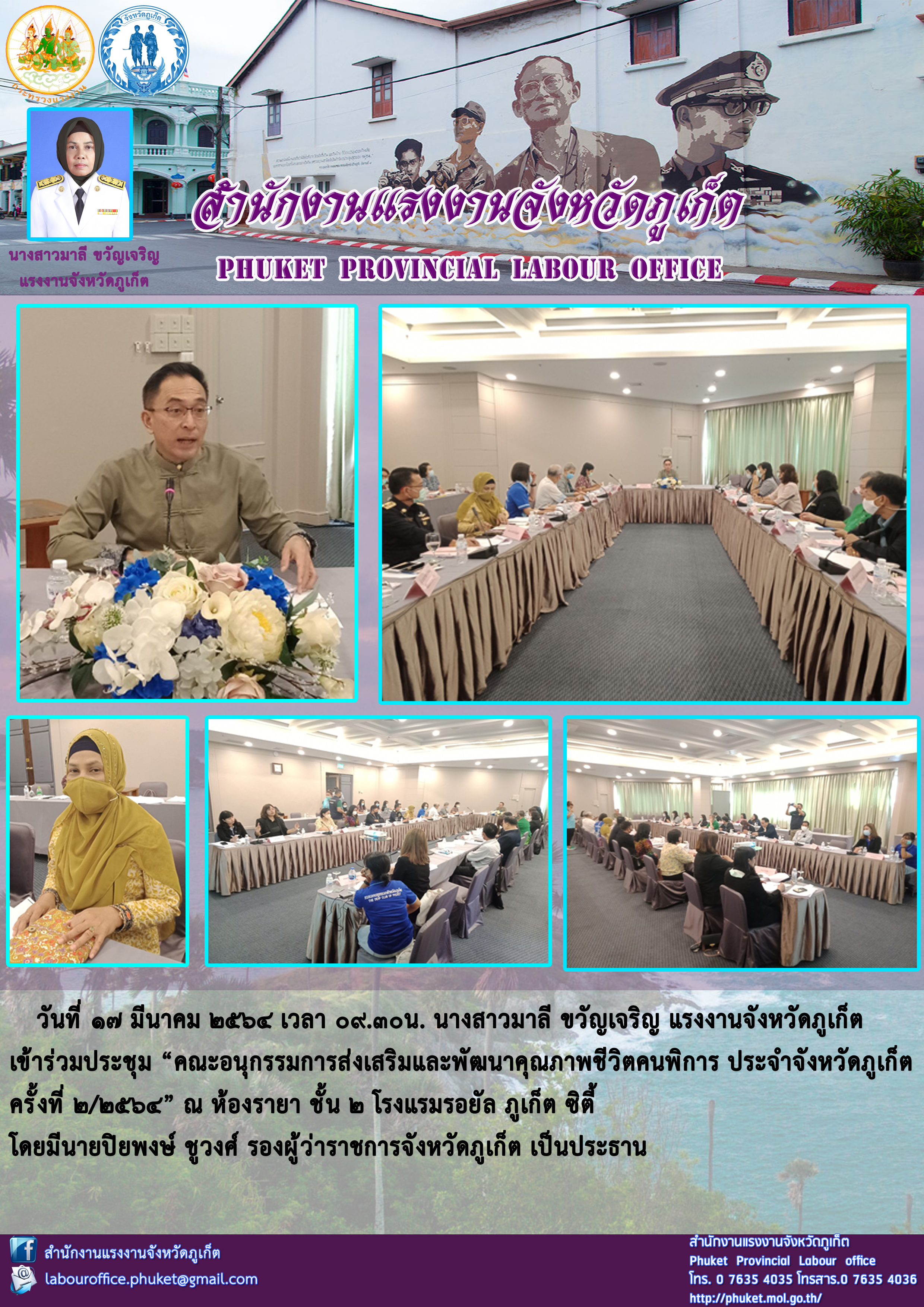 นางสาวมาลี ขวัญเจริญ แรงงานจังหวัดภูเก็ต เข้าร่วมประชุม “คณะอนุกรรมการส่งเสริมและพัฒนาคุณภาพชีวิตคนพิการ ประจำจังหวัดภูเก็ต ครั้งที่ 2/2564”