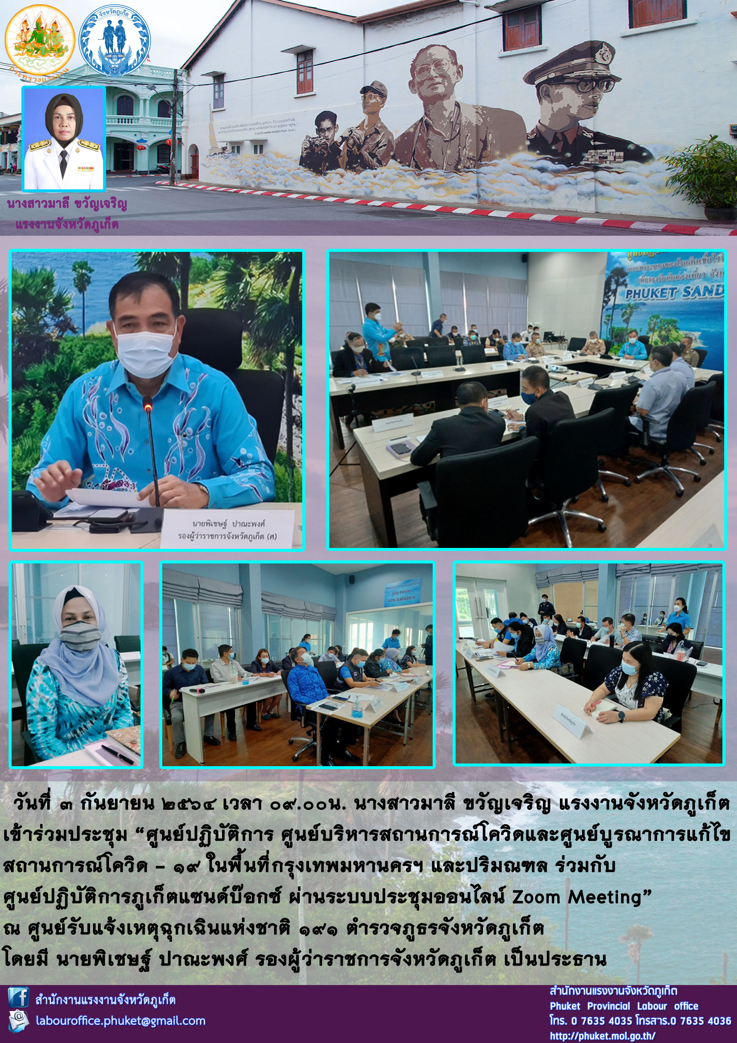 นางสาวมาลี ขวัญเจริญ แรงงานจังหวัดภูเก็ต เข้าร่วมประชุม “ศูนย์ปฏิบัติการ ศูนย์บริหารสถานการณ์โควิดและศูนย์บูรณาการแก้ไข สถานการณ์โควิด – 19 ในพื้นที่กรุงเทพมหานครฯ และปริมณฑล ร่วมกับ ศูนย์ปฏิบัติการภูเก็ตแซนด์บ๊อกซ์ ผ่านระบบประชุมออนไลน์ Zoom Meeting”