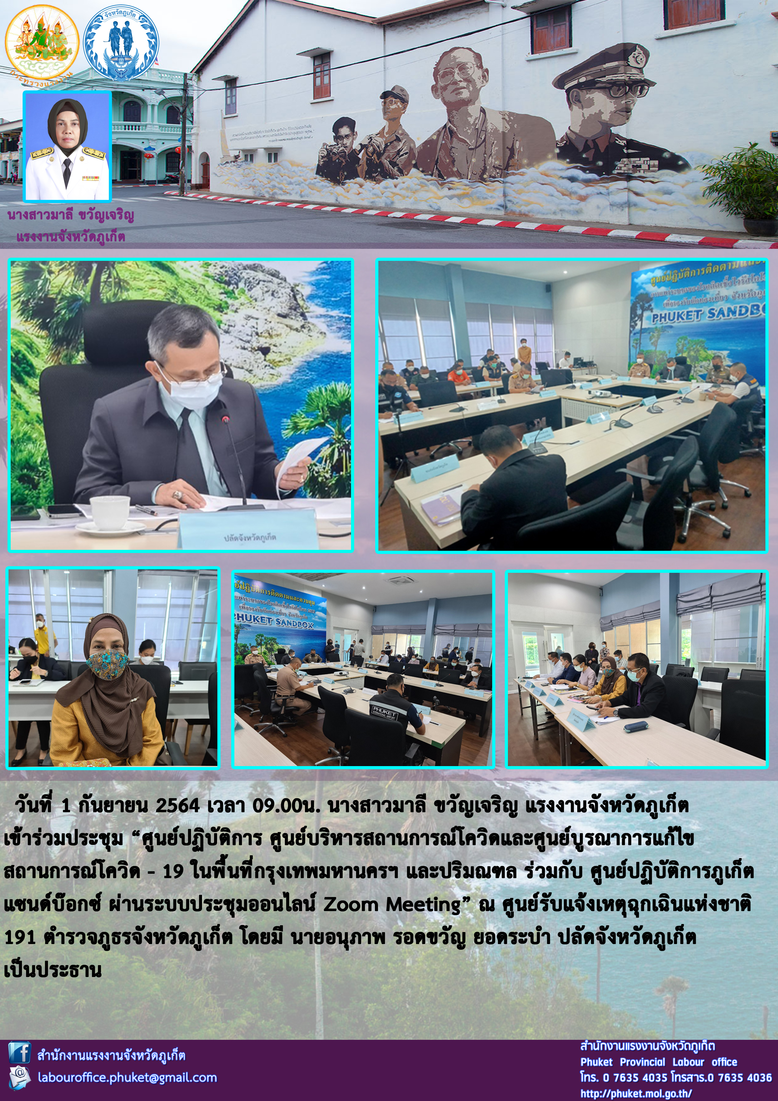 สำนักงานแรงงานจังหวัดภูเก็ต เข้าร่วมประชุม “ศูนย์ปฏิบัติการ ศูนย์บริหารสถานการณ์โควิดและศูนย์บูรณาการแก้ไข สถานการณ์โควิด – 19 ในพื้นที่กรุงเทพมหานครฯ และปริมณฑล ร่วมกับ ศูนย์ปฏิบัติการภูเก็ต แซนด์บ๊อกซ์ ผ่านระบบประชุมออนไลน์ Zoom Meeting”