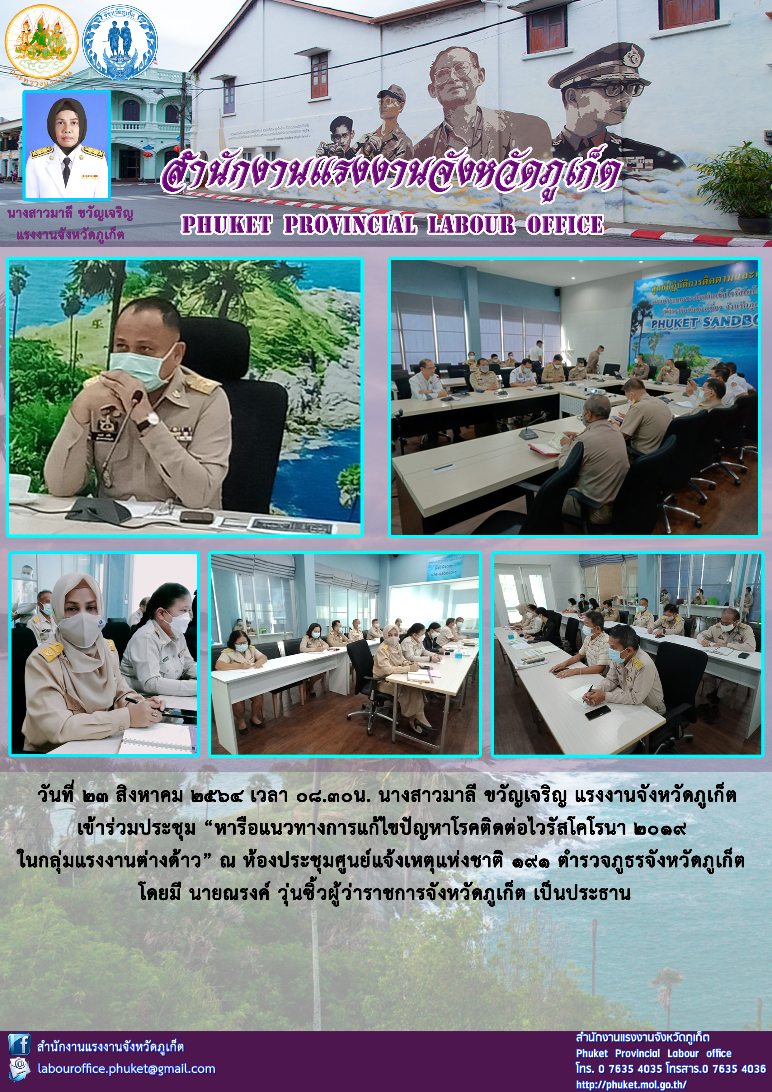 นางสาวมาลี ขวัญเจริญ แรงงานจังหวัดภูเก็ต เข้าร่วมประชุม “หารือแนวทางการแก้ไขปัญหาโรคติดต่อไวรัสโคโรนา 2019 ในกลุ่มแรงงานต่างด้าว”