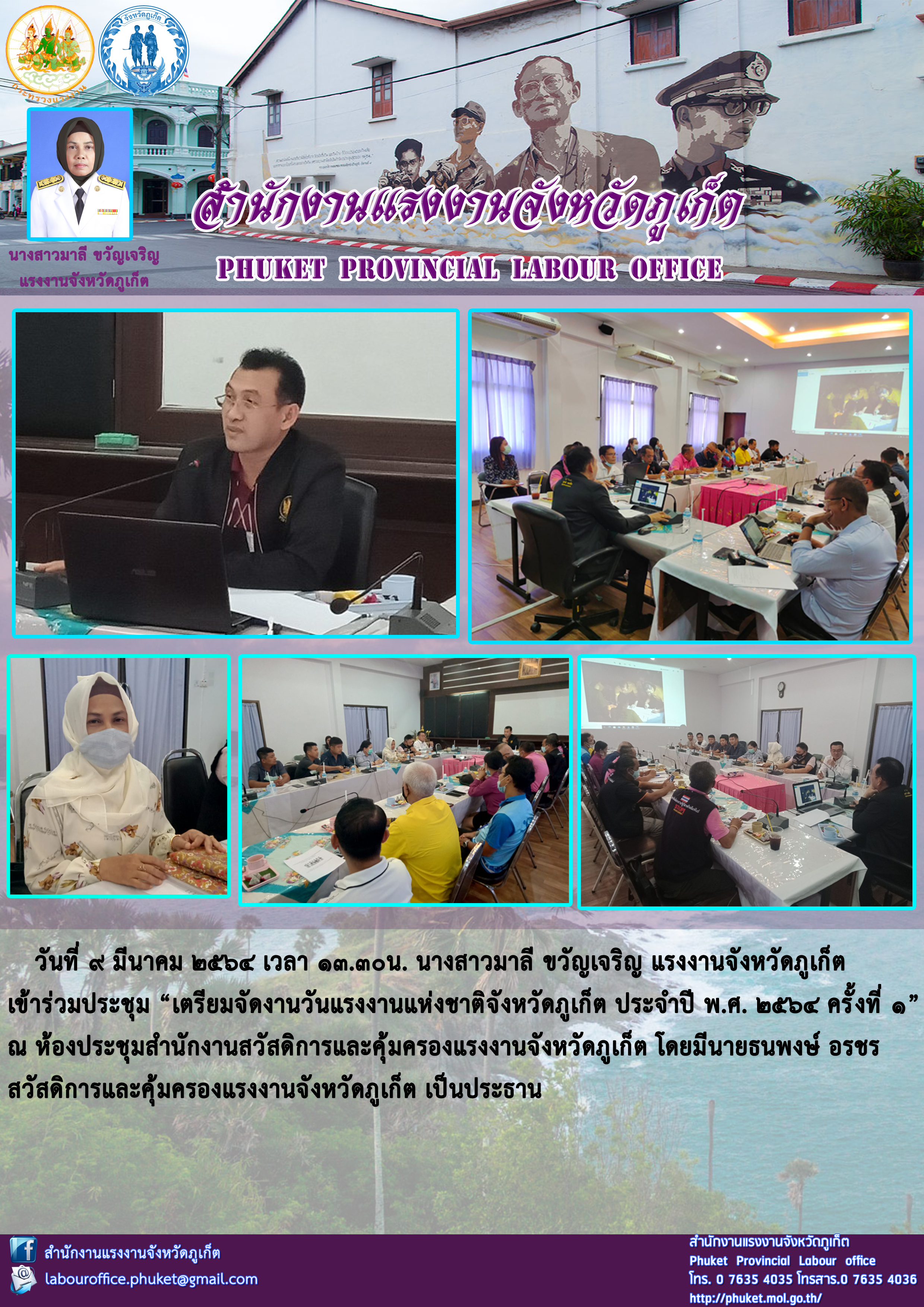 นางสาวมาลี ขวัญเจริญ แรงงานจังหวัดภูเก็ต เข้าร่วมประชุม “เตรียมจัดงานวันแรงงานแห่งชาติจังหวัดภูเก็ต ประจำปี พ.ศ. 2564 ครั้งที่ 1”