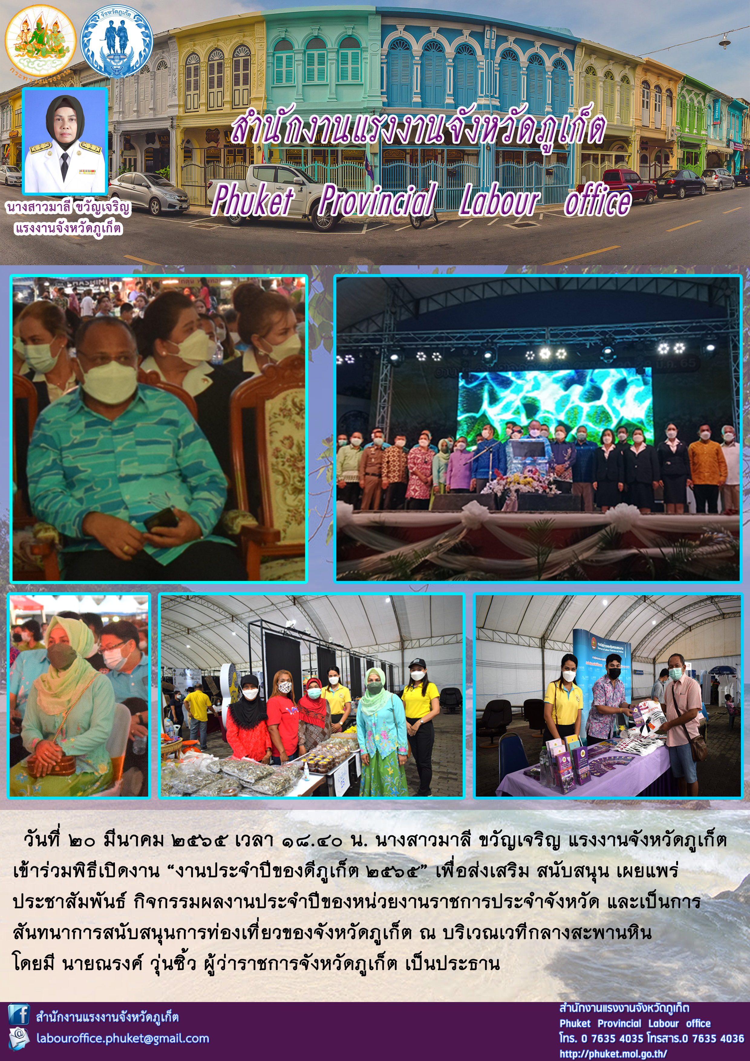 นางสาวมาลี ขวัญเจริญ แรงงานจังหวัดภูเก็ต เข้าร่วมพิธีเปิดงาน “งานประจำปีของดีภูเก็ต 2565”