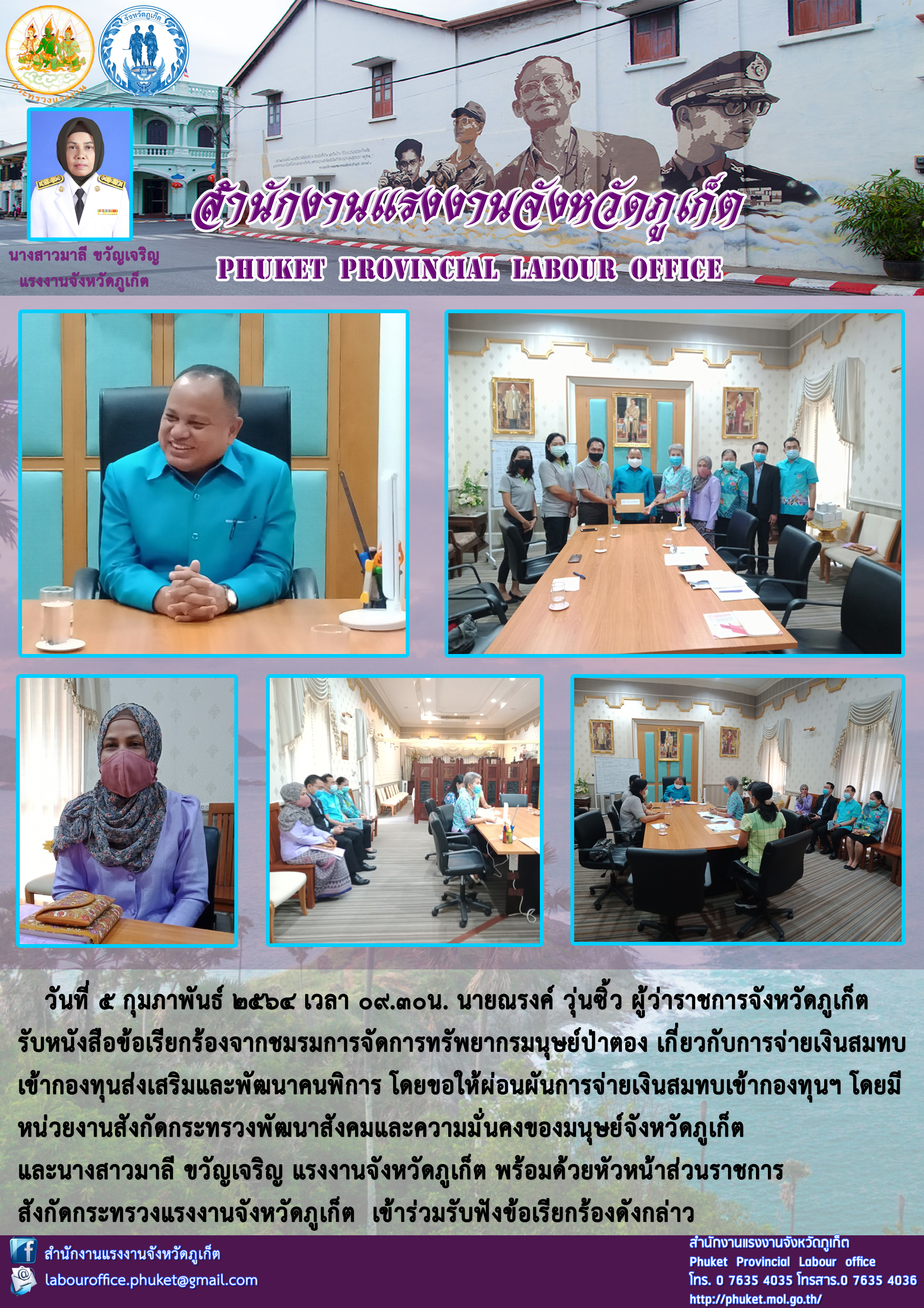 นางสาวมาลี ขวัญเจริญ แรงงานจังหวัดภูเก็ต เข้าร่วมรับฟังข้อเรียกร้อง เกี่ยวกับการจ่ายเงินสมทบ เข้ากองทุนส่สังงเสริมและพัฒนาคนพิการ โดยมี หน่วยงานสังกัดกระทรวงพัฒนาคมและความมั่นคงของมนุษย์จังหวัดภูเก็ต และพร้อมด้วยหัวหน้าส่วนราชการสังกัดกระทรวงแรงงานจังหวัดภูเก็ต เข้าร่วมรับฟังข้อเรียกร้องดังกล่าว