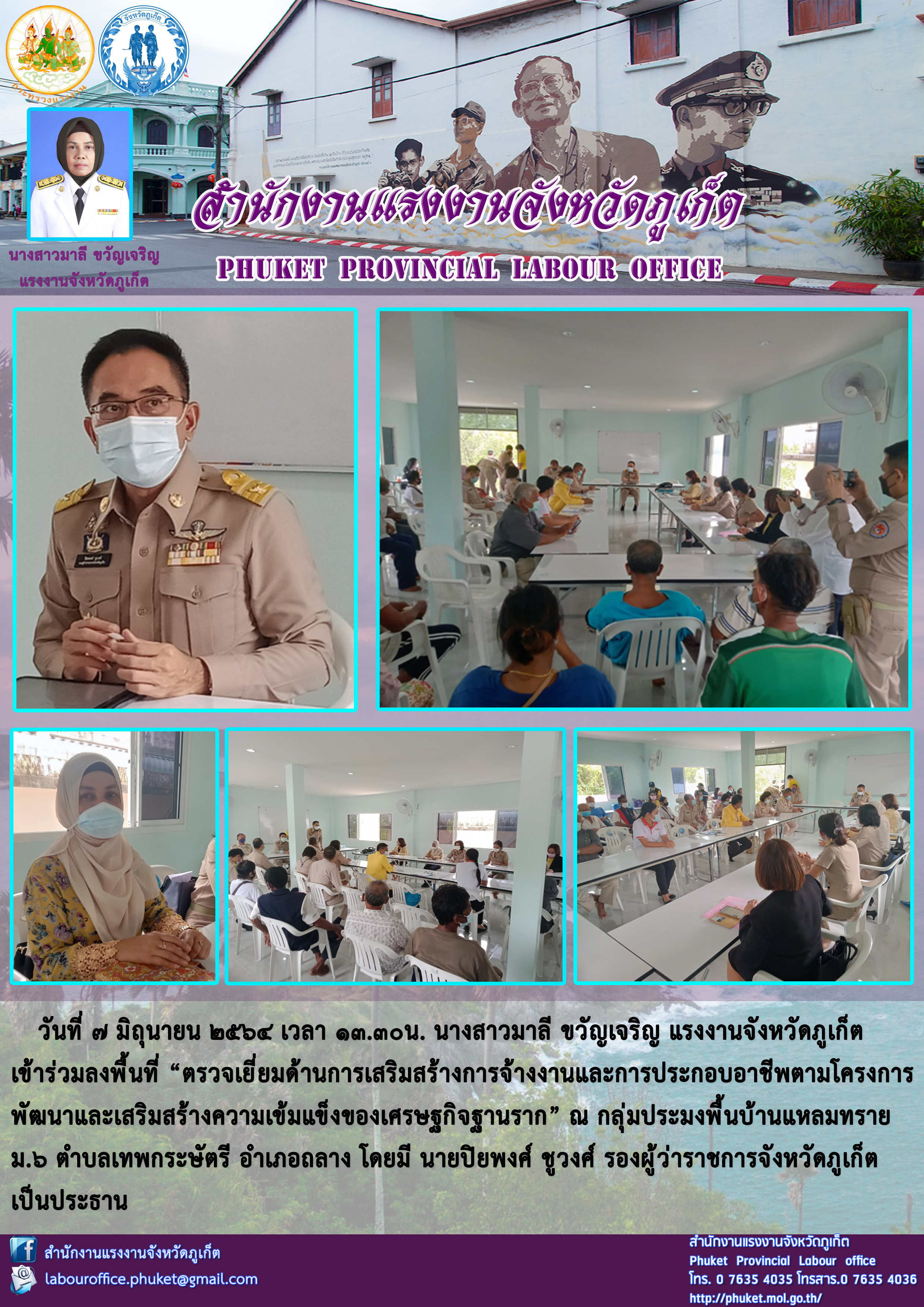 นางสาวมาลี ขวัญเจริญ แรงงานจังหวัดภูเก็ต เข้าร่วมลงพื้นที่ “ตรวจเยี่ยมด้านการเสริมสร้างการจ้างงานและการประกอบอาชีพตามโครงการ พัฒนาและเสริมสร้างความเข้มแข็งของเศรษฐกิจฐานราก”