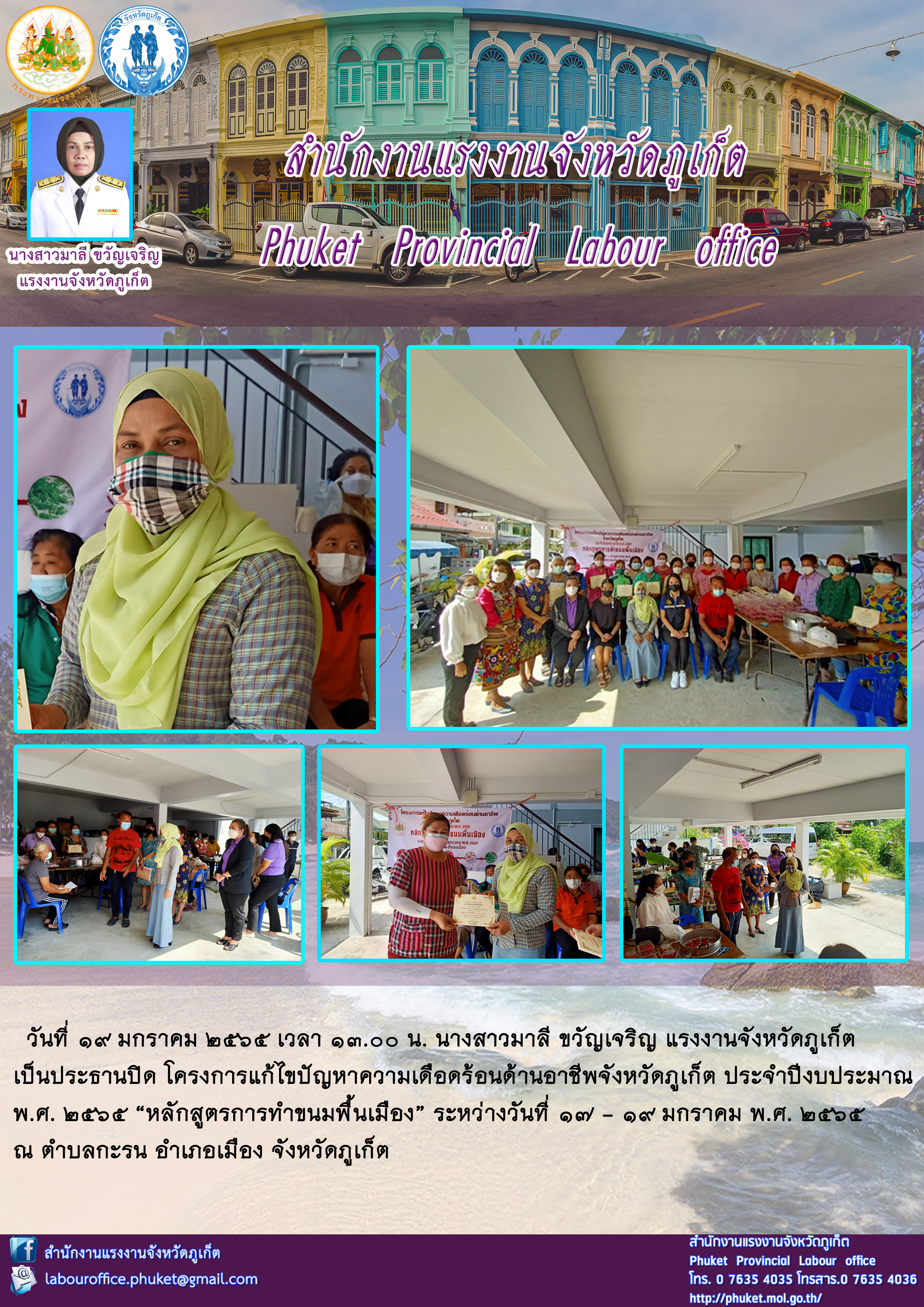 แรงงานจังหวัดภูเก็ต เป็นประธานปิด โครงการแก้ไขปัญหาความเดือดร้อนด้านอาชีพจังหวัดภูเก็ต ประจำปีงบประมาณ พ.ศ. 2565 “หลักสูตรการทำขนมพื้นเมือง”