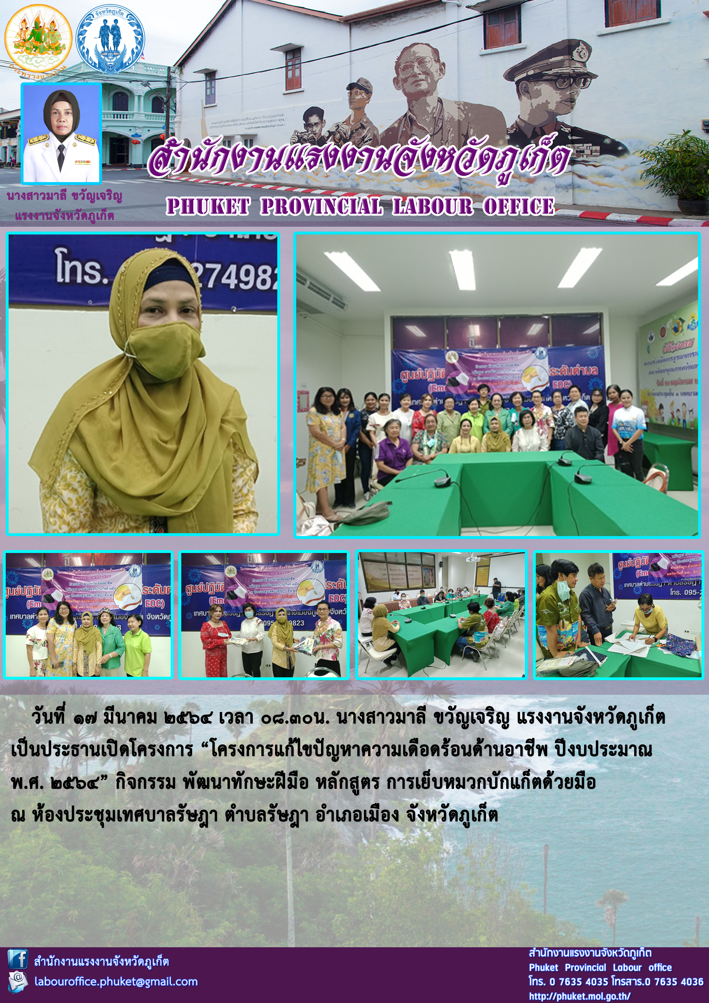 นางสาวมาลี ขวัญเจริญ แรงงานจังหวัดภูเก็ต เป็นประธานเปิดโครงการ “โครงการแก้นางสาวมาลี ขวัญเจริญ แรงงานจังหวัดภูเก็ต เป็นประธานเปิดโครงการ “โครงการแก้ไขปัญหาความเดือดร้อนด้านอาชีพ ปีงบประมาณ พ.ศ. 2564” กิจกรรม พัฒนาทักษะฝีมือ หลักสูตร การเย็บหมวกบักแก็ตด้วยมือไขปัญหาความเดือดร้อนด้านอาชีพ ปีงบประมาณ พ.ศ. 2564” กิจกรรม พัฒนาทักษะฝีมือ หลักสูตร การเย็บหมวกบักแก็ตด้วยมือ