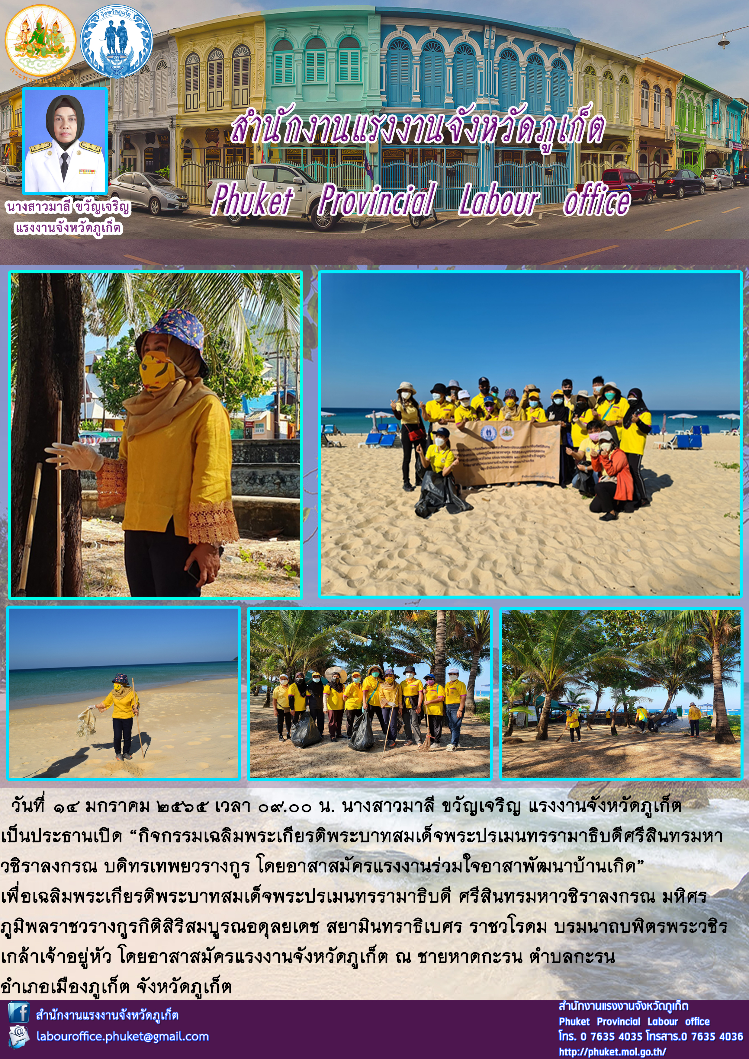 แรงงานจังหวัดภูเก็ต เป็นประธานเปิด “กิจกรรมเฉลิมพระเกียรติพระบาทสมเด็จพระปรเมนทรรามาธิบดีศรีสินทรมหา วชิราลงกรณ บดิทรเทพยวรางกูร โดยอาสาสมัครแรงงานร่วมใจอาสาพัฒนาบ้านเกิด”