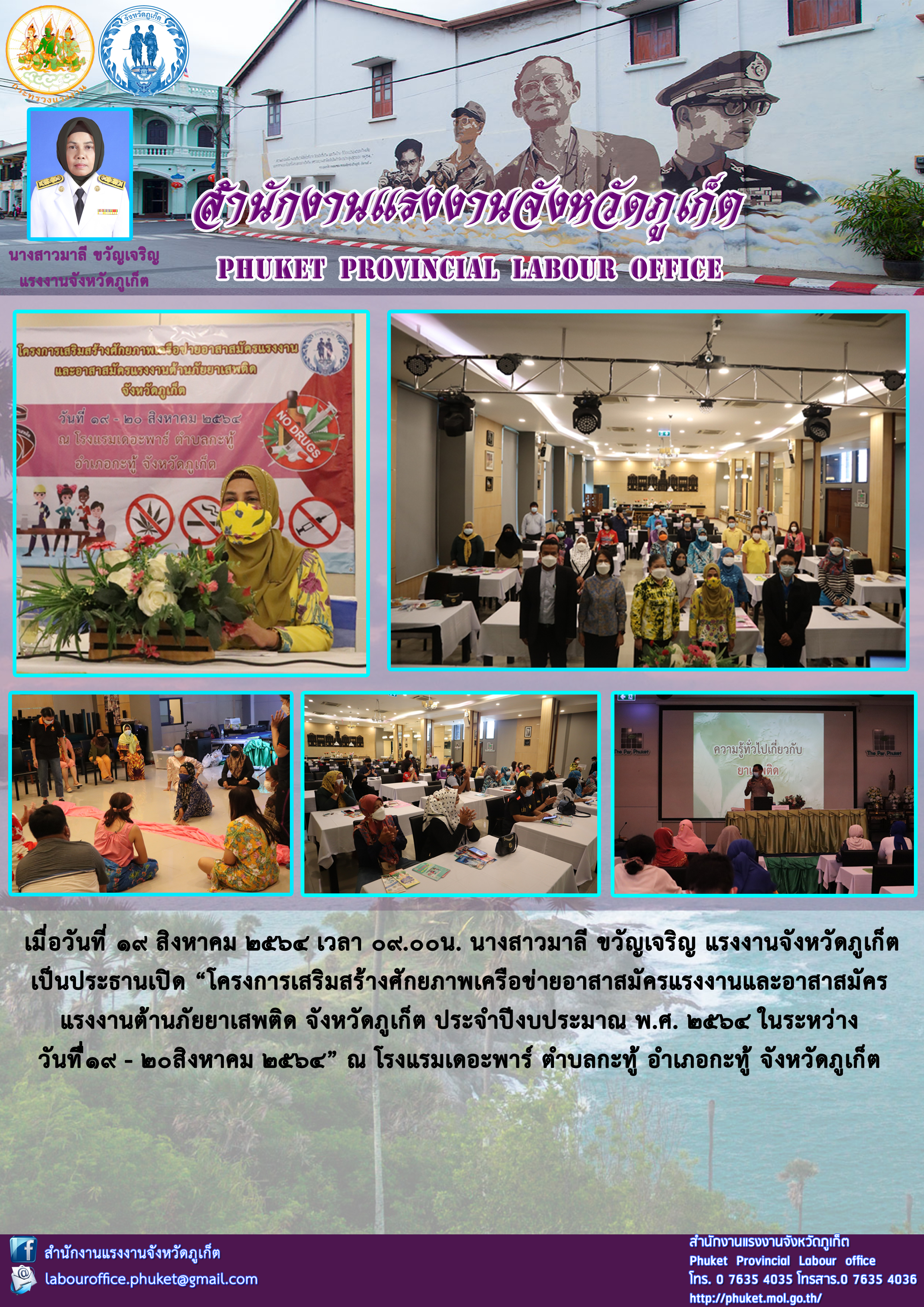 นางสาวมาลี ขวัญเจริญ แรงงานจังหวัดภูเก็ต เป็นประธานเปิด “โครงการเสริมสร้างศักยภาพเครือข่ายอาสาสมัครแรงงานและอาสาสมัคร แรงงานต้านภัยยาเสพติด จังหวัดภูเก็ต ประจำปีงบประมาณ พ.ศ. 2564 ในระหว่าง วันที่ื19 – 20สิงหาคม 2564”