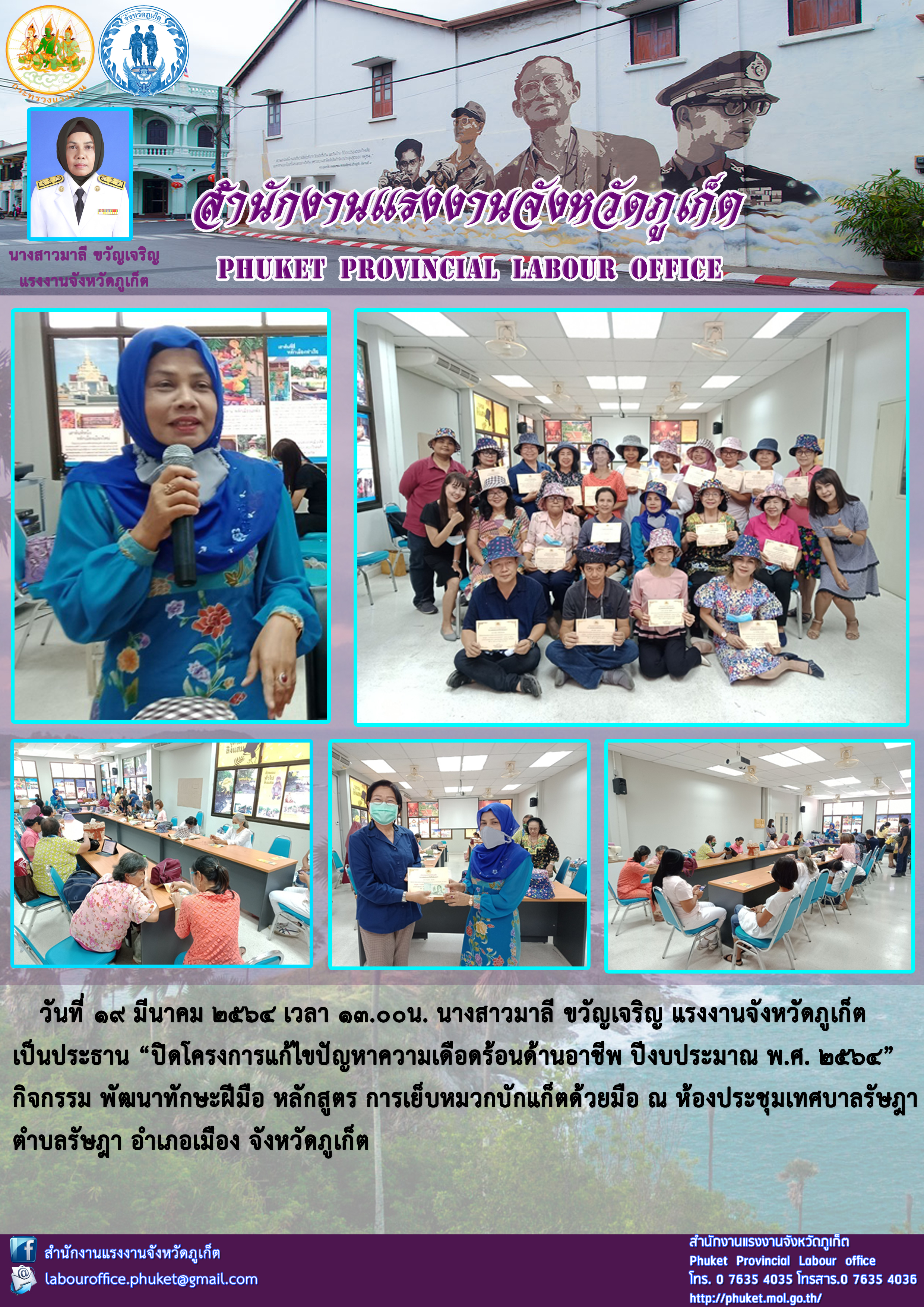 นางสาวมาลี ขวัญเจริญ แรงงานจังหวัดภูเก็ต เป็นประธาน “ปิดโครงการแก้ไขปัญหาความเดือดร้อนด้านอาชีพ ปีงบประมาณ พ.ศ. 2564”