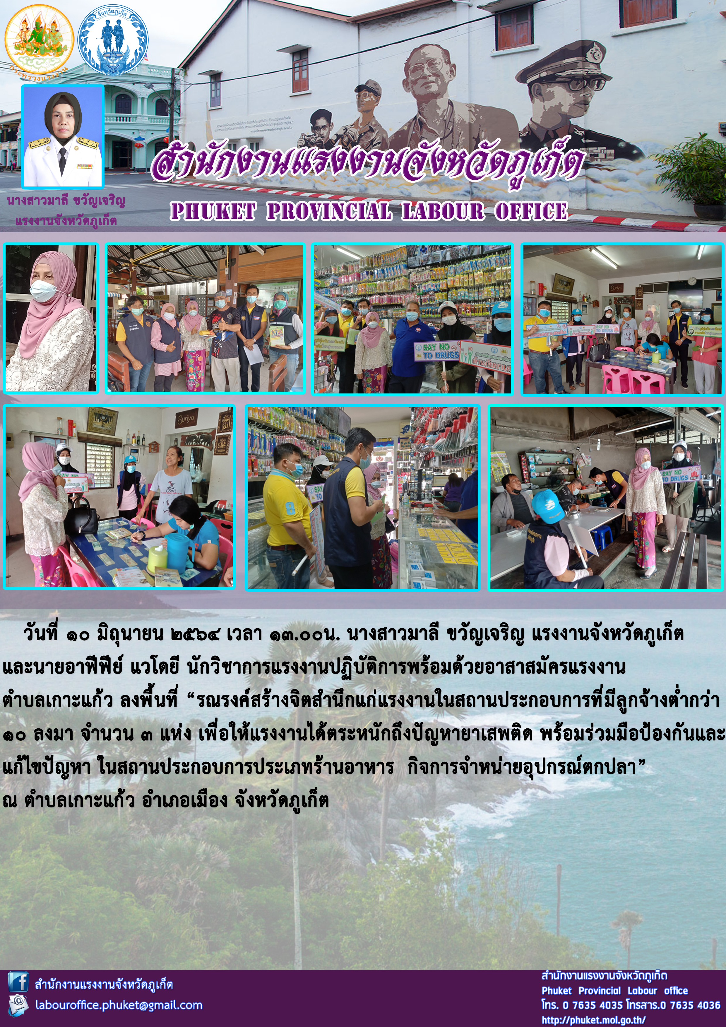 สำนักงานแรงงานจังหวัดภูเก็ต ลงพื้นที่ “รณรงค์สร้างจิตสำนึกแก่แรงงานในสถานประกอบการที่มีลูกจ้างต่ำเพื่อให้แรงงานได้ตระหนักถึงปัญหายาเสพติด พร้อมร่วมมือป้องกันและ แก้ไขปัญหา ในสถานประกอบการประเภทร้านอาหาร กิจการจำหน่ายอุปกรณ์ตกปลา”
